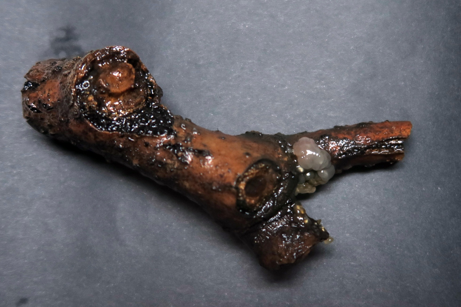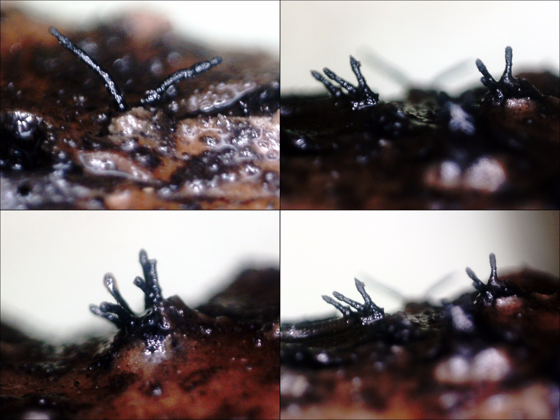Ahora y ya casi tres meses después he podido observar los cuernecillos en ramillete típicos de la Eutypella scoparia. Os dejo una composición de imágenes macro del mismo.