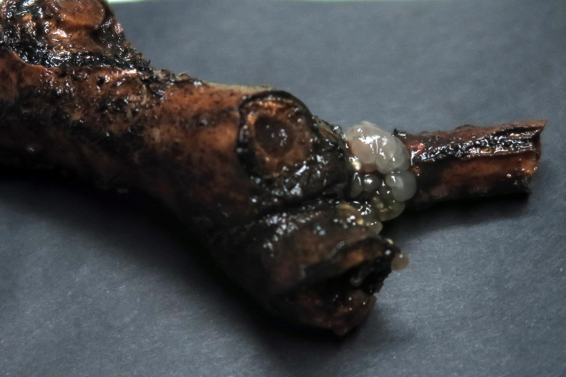 En aquel momento por sus características microscópicas determiné que muy probablemente se trataba de Eutypella scoparia, según Mycobank y Peroneutypa scoparia según Index Fungorum, como no me encajaba su aspecto macroscópico y tenía dudas entre esta y la Calosphaeria parasitica, con una morfología y tamaño esporal bastante parecidas, decidí partir el tronco en dos e hidratarlo para observar su desarrollo.
