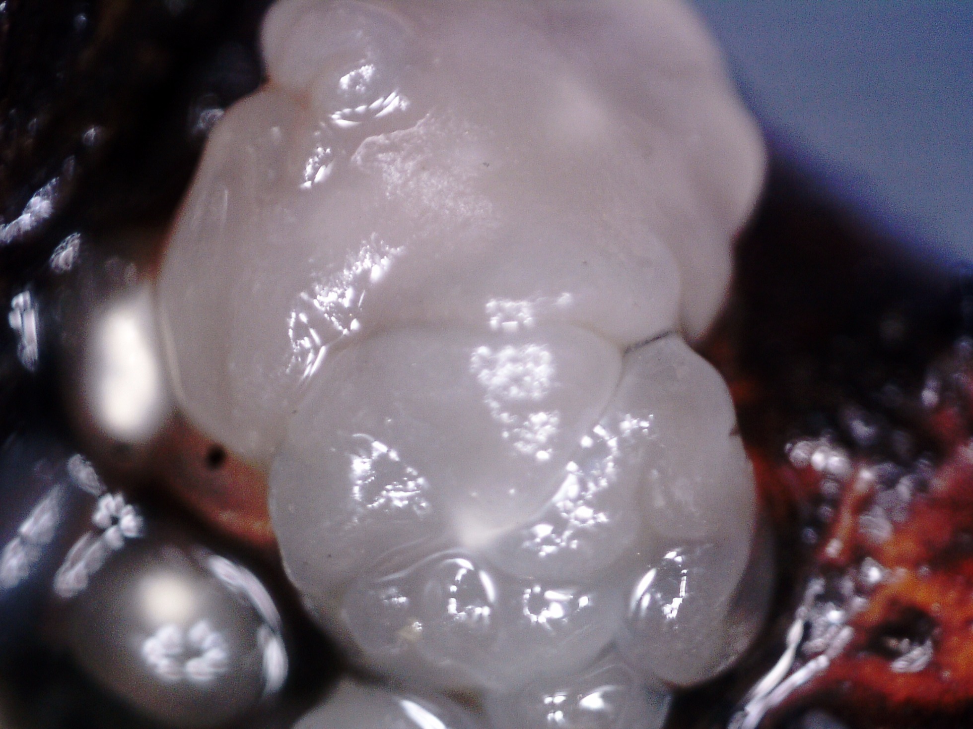 Fructificaciones mas o menos globosas, de menos de un cm., agrupándose entre ellas y adquiriendo un aspecto cerebriforme, de un color blanquecino con tintes rosados. De consistencia acuosa y gelatinosa, opaco y con inclusiones bien visibles de Oxalato de cal.