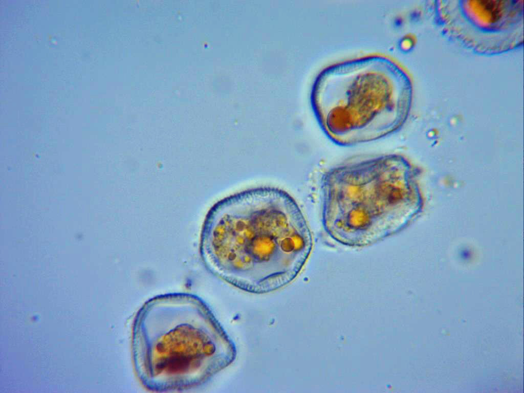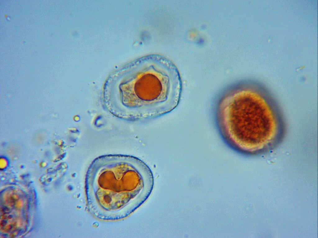 Eciosporas en agua a 1000 aumentos.