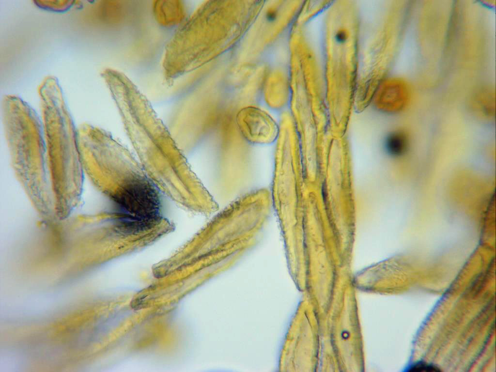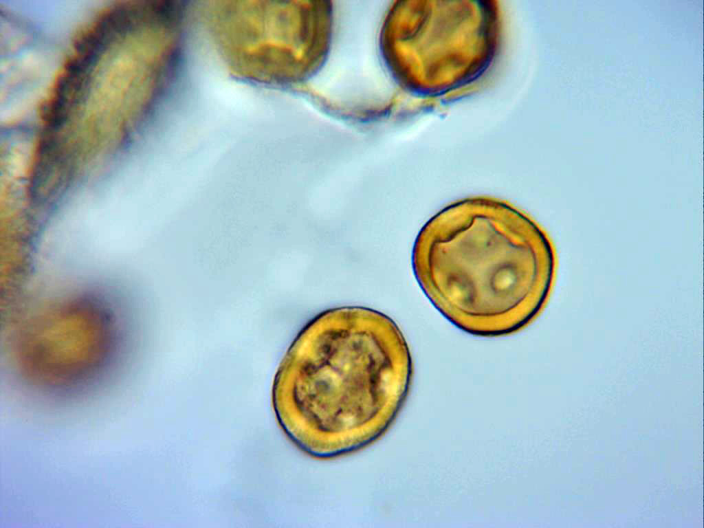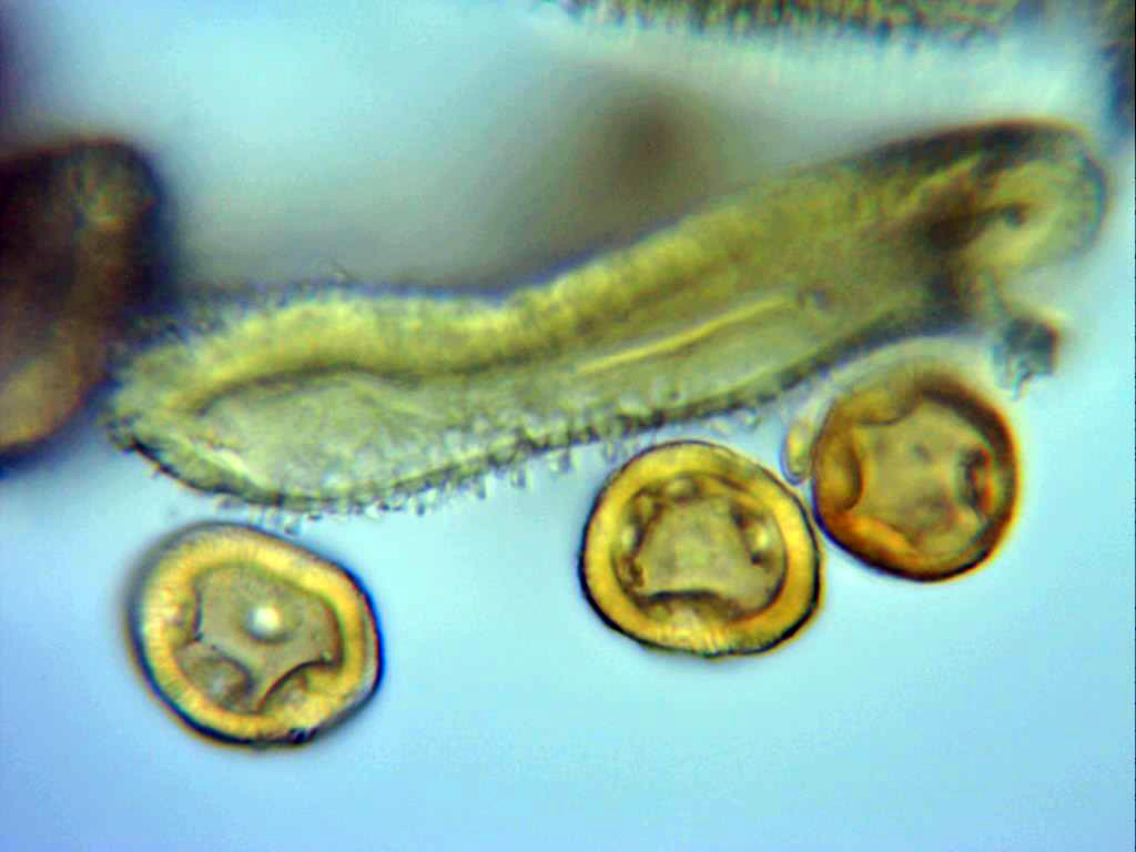 Peridio a 1000 aumentos en solución de Melzer y una eciospora.