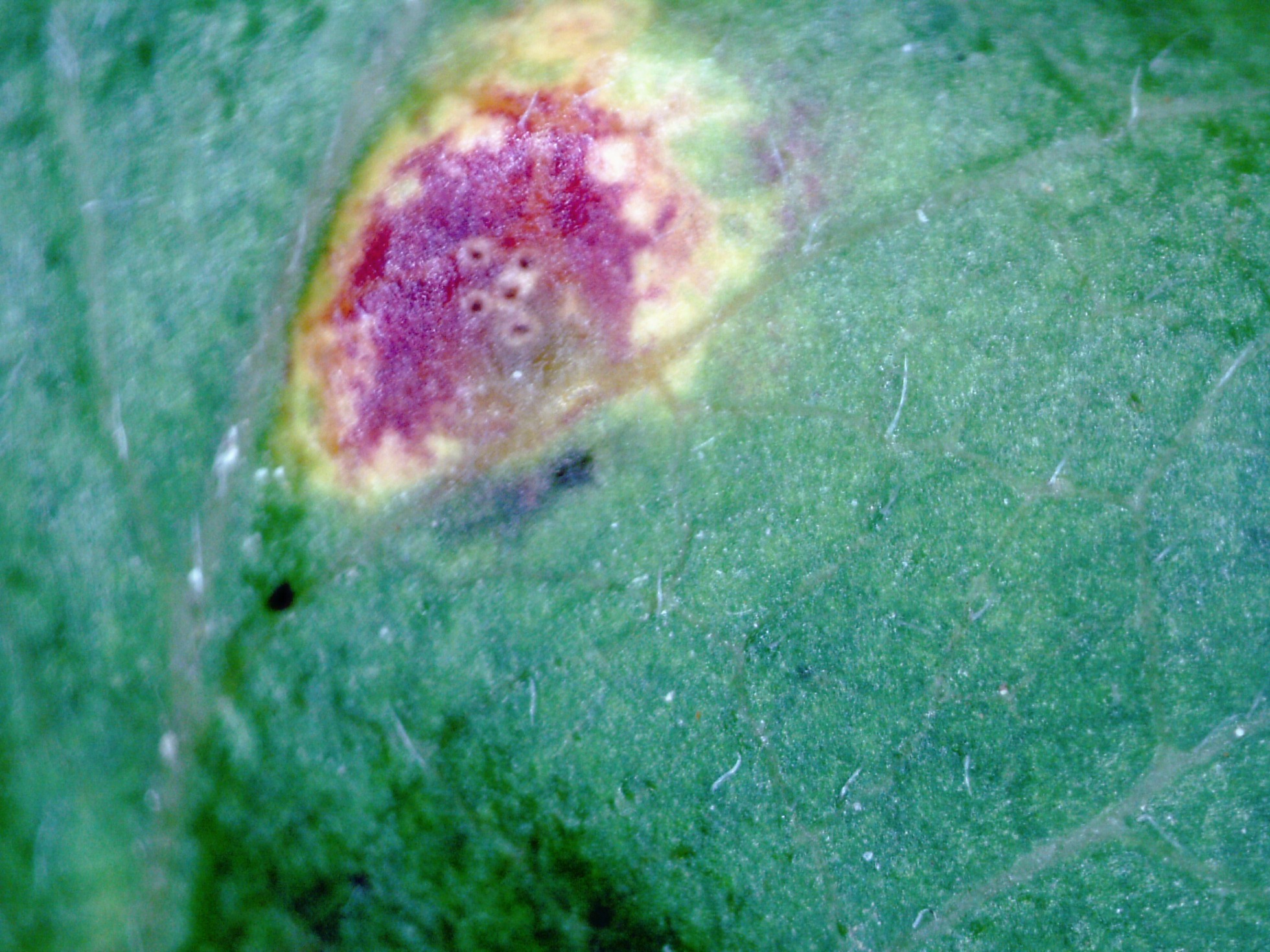 Una roya que produce unas pequeñas manchas en las hojas, con una decoloración de estas con el centro rojizo.