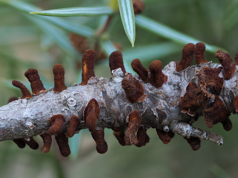 Tal y como nos indica Javier el Gimnosporangium fuscum = Gymnosporangium sabinae parasita a rosaceas del género Pyrus, "perales".