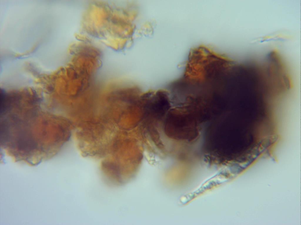 Solo pude observar sus esporas y un contexto muy pigmentado y de un color muy oscuro (prácticamente negro), en la imagen el contexto a 1000 aumentos en reactivo de Melzer, en este caso de un color entre pardo y marrón oscuro.