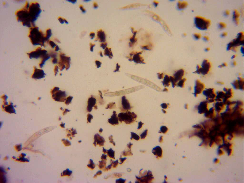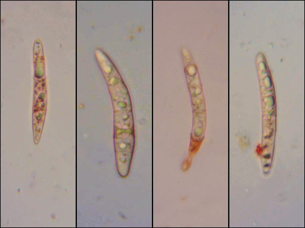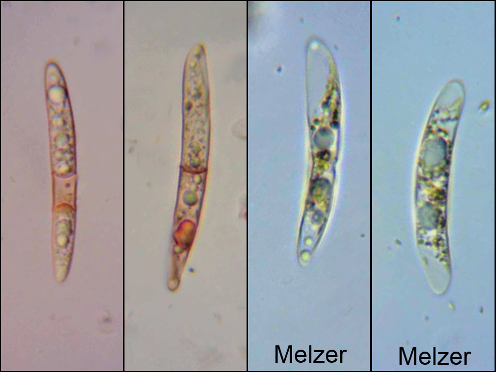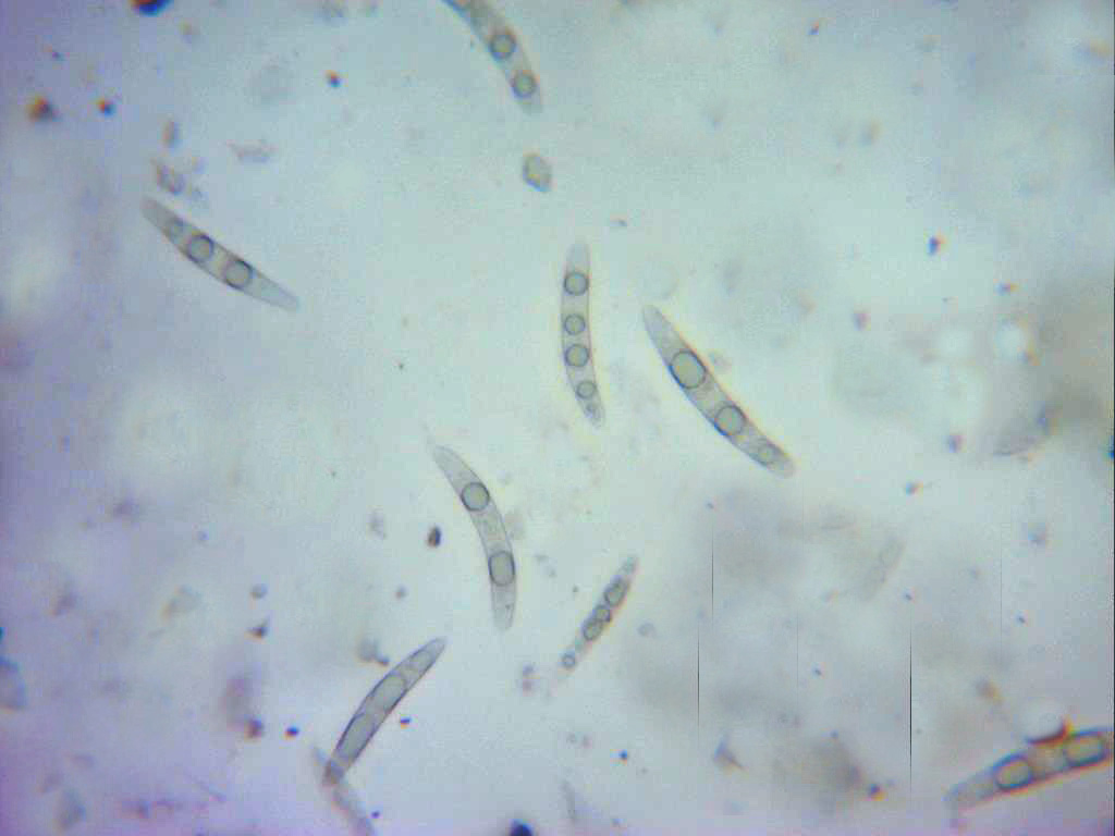 Sus esporas, fusiformes, hialinas, con contenido granuloso en su interior y algunas con un septo en su parte central (como las dos primeras de la última imagen).