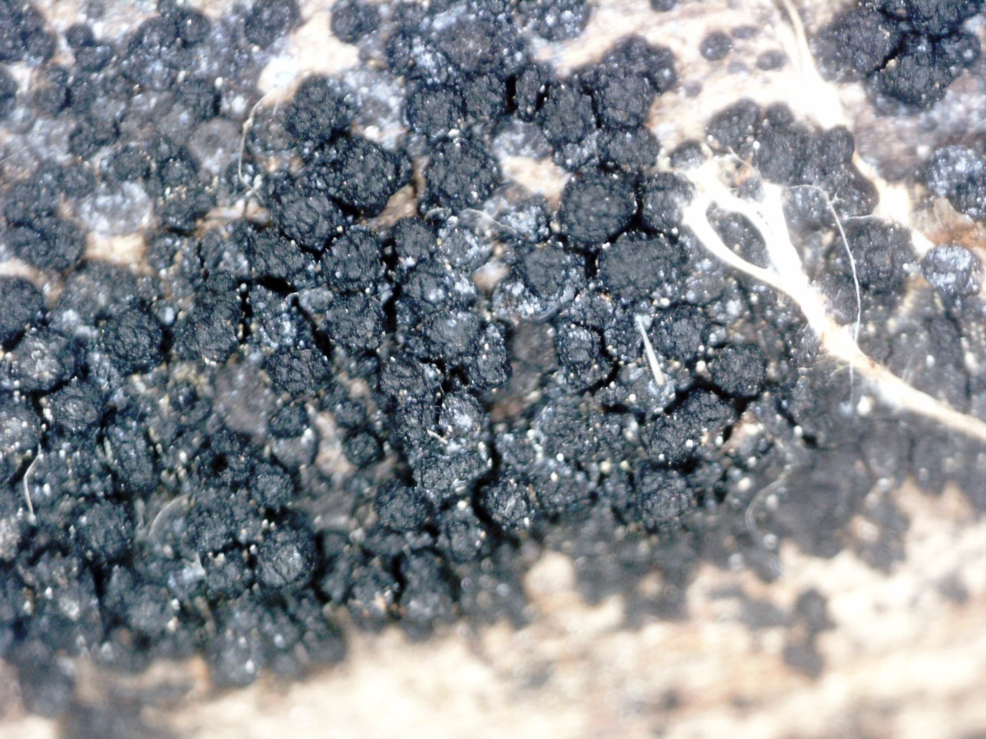 Pequeños peritecios de un color negruzco, de muy pequeño tamaño (su diámetro apenas sobrepasaba de 1 mm.), con una superficie verrucosa y granulosa cuyo aspecto nos recuerda al de una "mora" (deduzco que de ahí se deriva su nombre), apareciendo de forma masiva sobre un pequeño tronco y ocupando gran parte de su superficie, al encontrármela ya me di cuenta en seguida que estaba ante un "cromo nuevo".