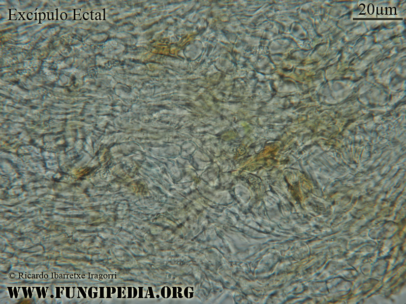 Pequeño Ascoma de hasta 0,6mm, sésil o con un pequeño pie. Comienza siendo de color marrón-grisáceo en los ejemplares jóvenes y húmedos y posteriormente, con la madurez y la deshidratación va adquiriendo tonos amarillentos.