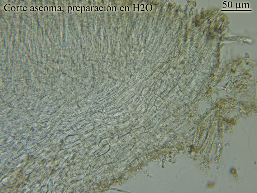 En un principio pensamos que crecía sobre tallos de la planta (Geum urbanum) identificada gracias a Laura, casi estábamos convencidos que crecía sobre ella, pero una vez en casa la micro desveló el hospedador, necesariamente peciolos de Fraxinus.