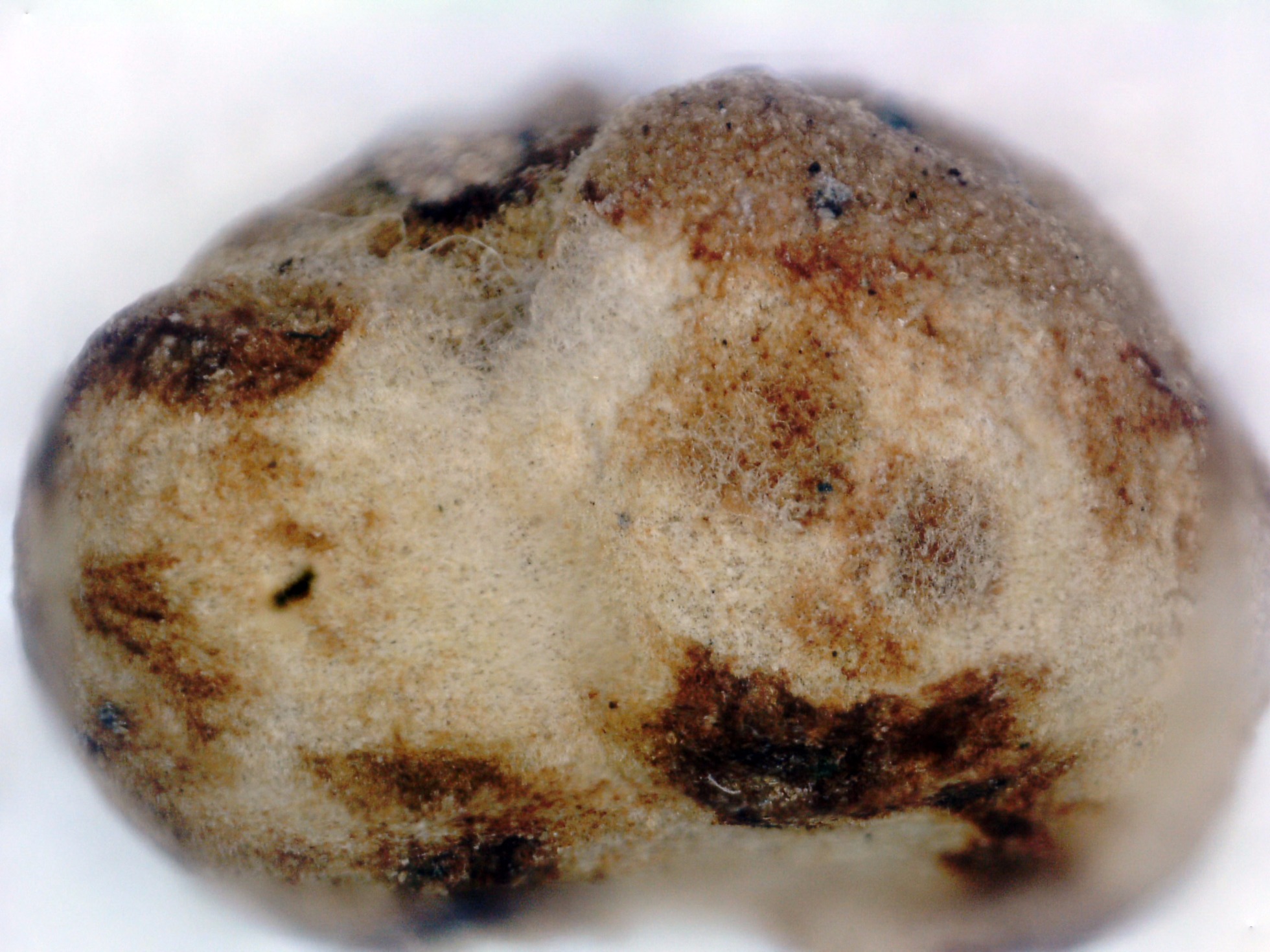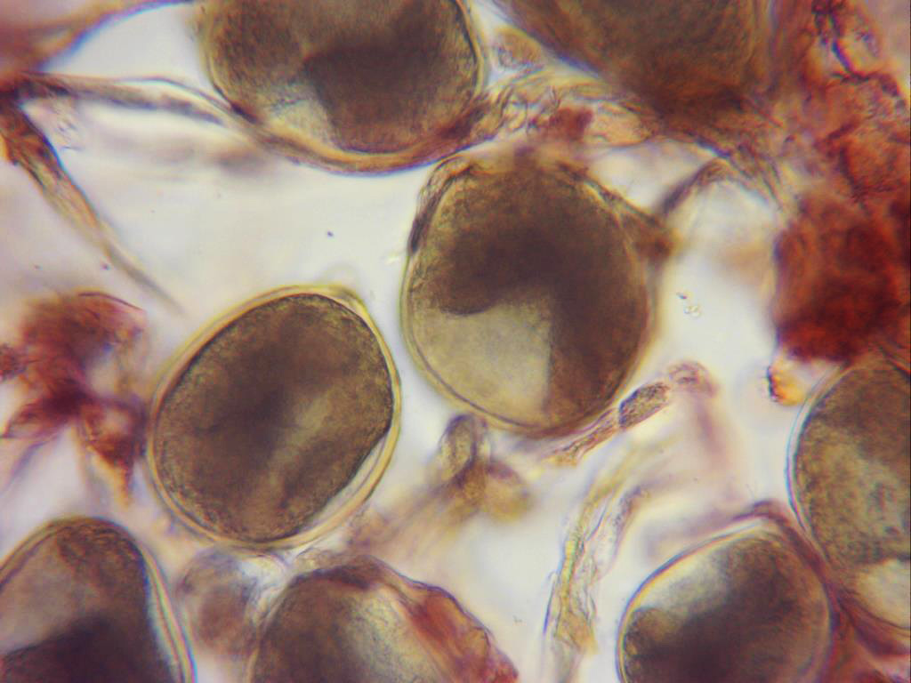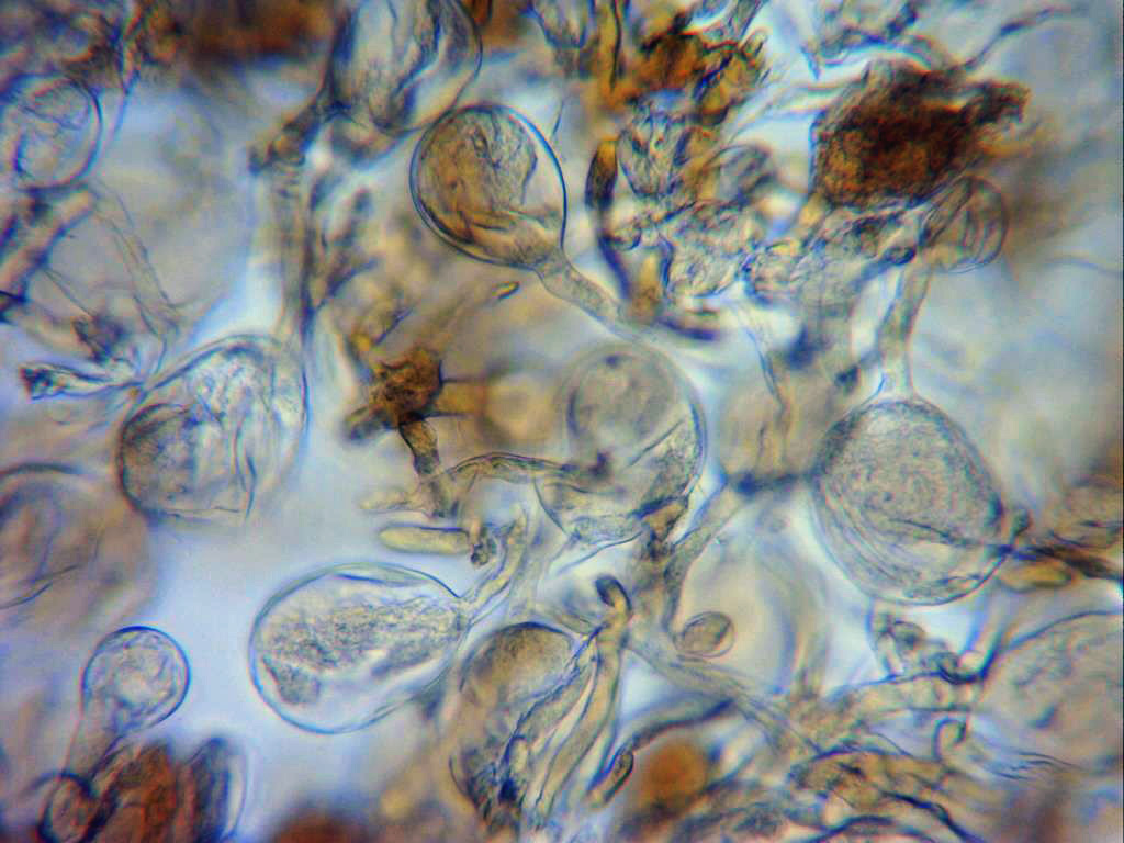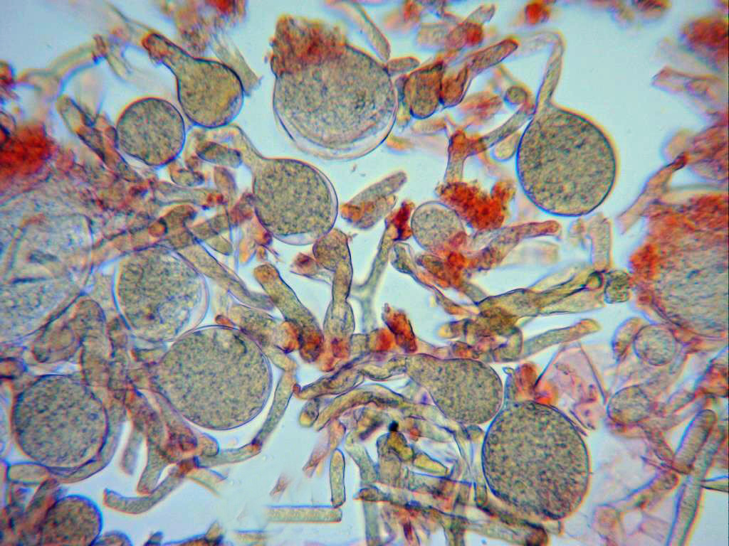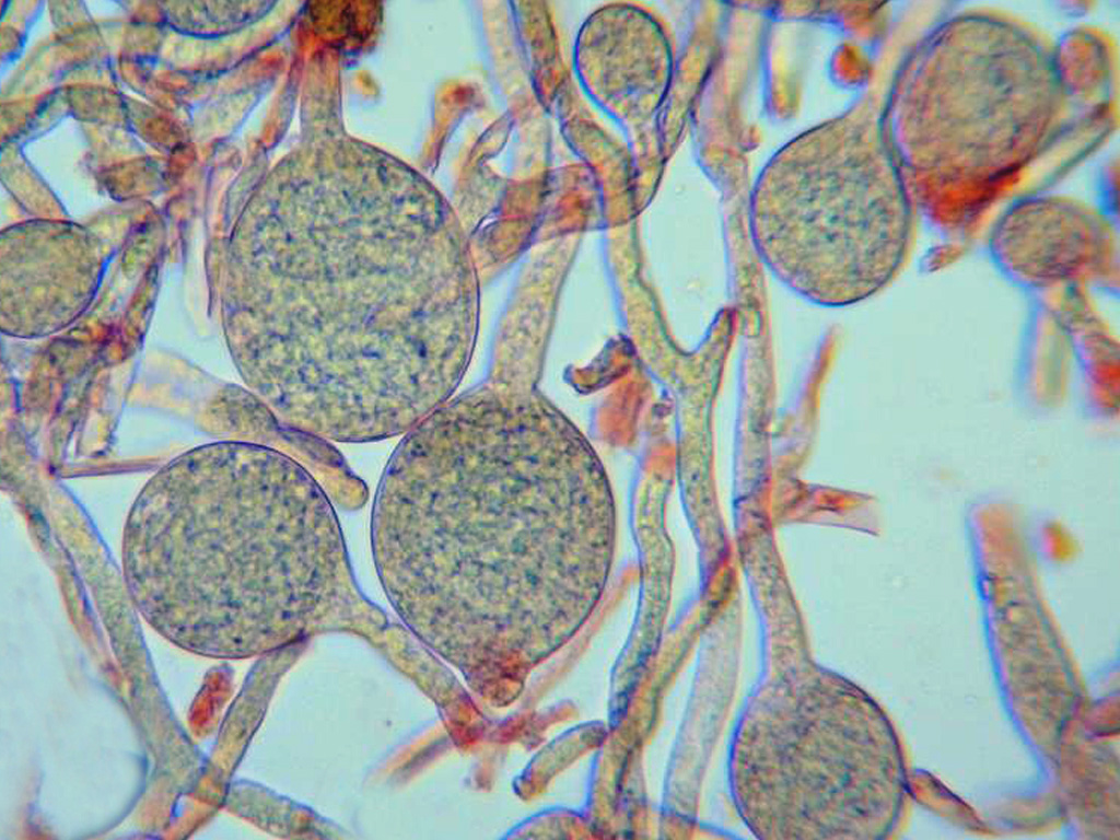 Esporas del interior de la gleba a 400 aumentos, en la misma solución que las anteriores, de color marrón pardo, entre globosas y ligeramente elipsoides, con una pared gruesa bien diferenciada, en este caso las medidas de 86 a 122,3 micras de largo por hasta 83 micras de ancho. En este caso las hifas también presentaban una anchura mayor, de entre 11,3 a 23,2 micras. La pared de las mismas de entre 4,3 a 6,8 micras.
