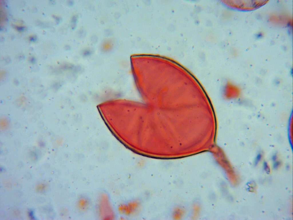 Esporas a 400 aumentos en solución de KOH, de color amarillo pálido, en este caso ya habían vertido parte de su contenido.