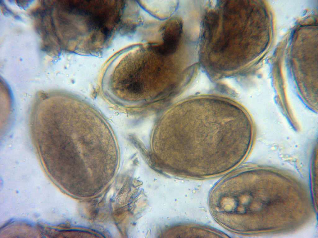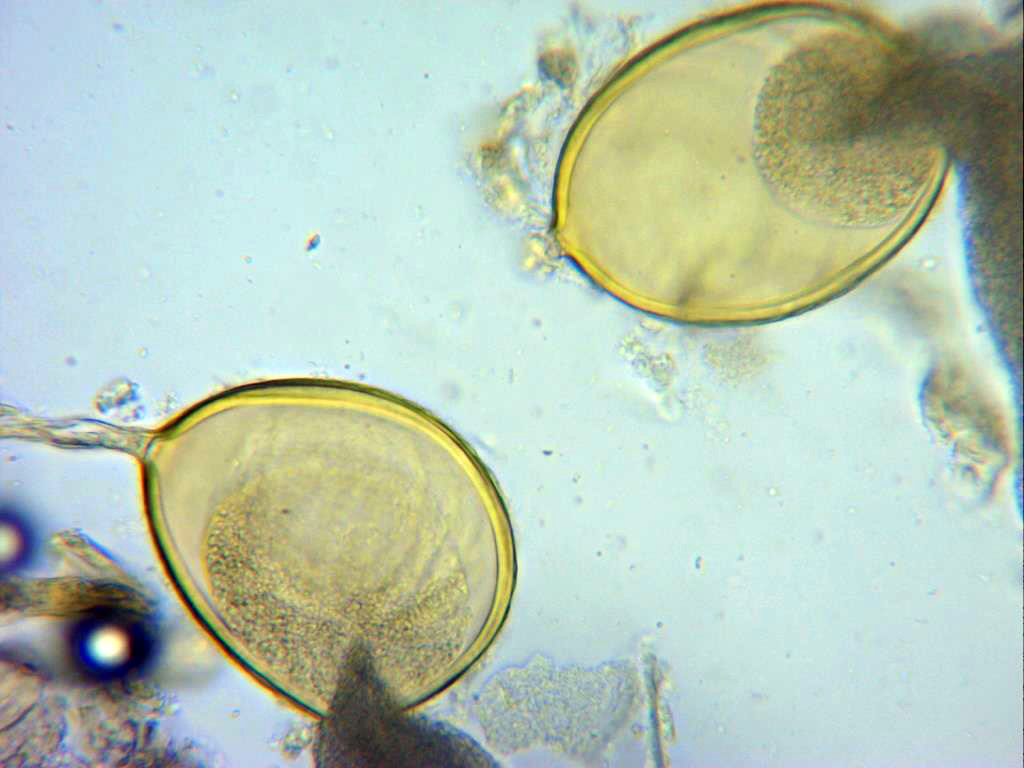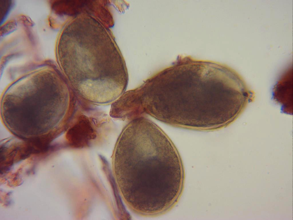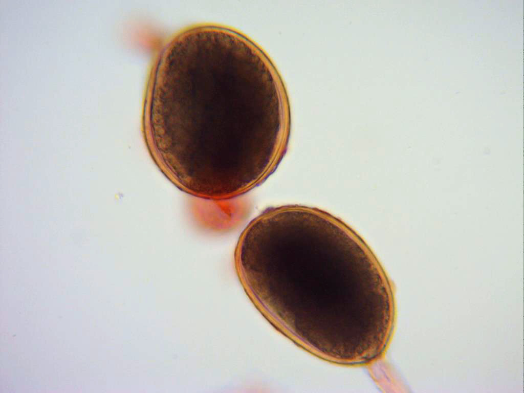 Una nueva imagen de esporas, con una espora marcadamente elipsoide, se aprecia bien en su interior un contenido granuloso y opaco.