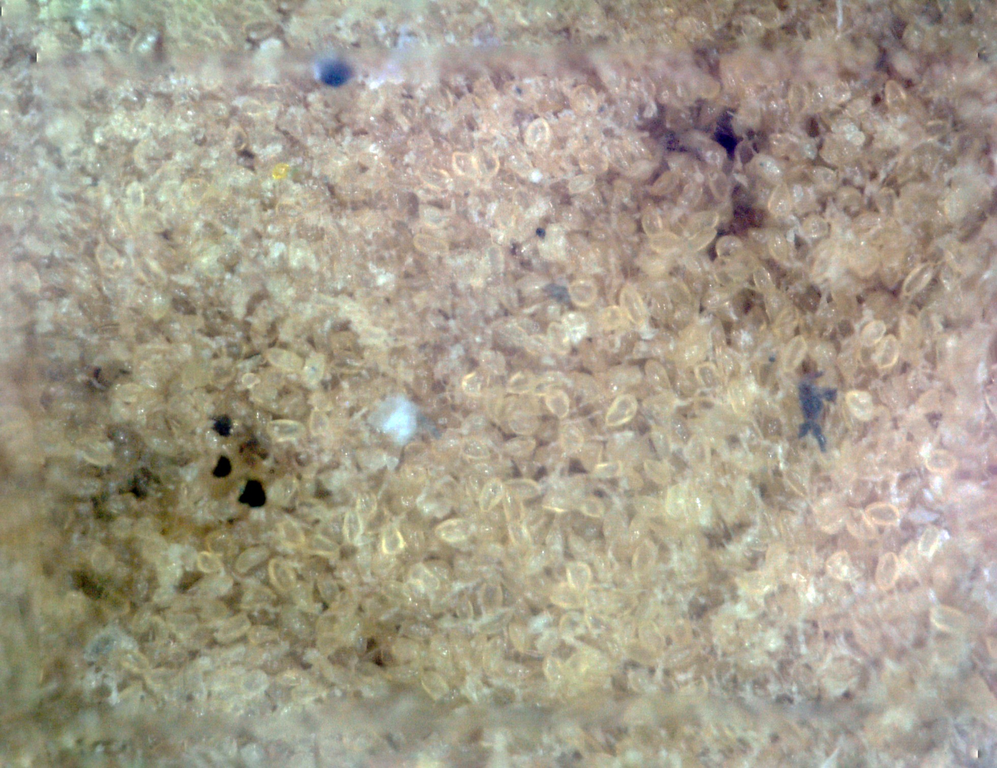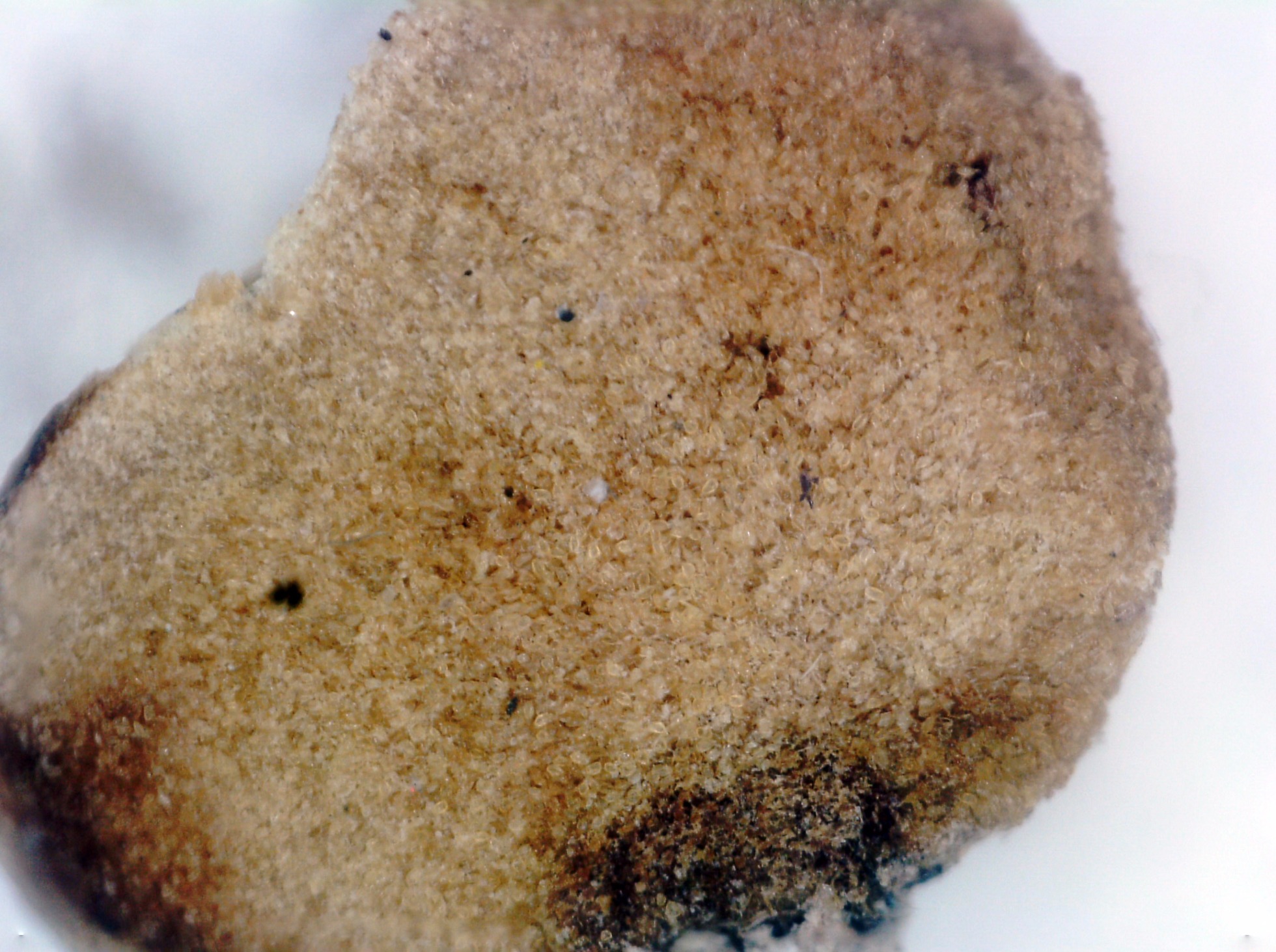 Imagen de la sección de la gleba a 100 aumentos, ya puede apreciarse el aspecto granuloso, debido a las esporas.