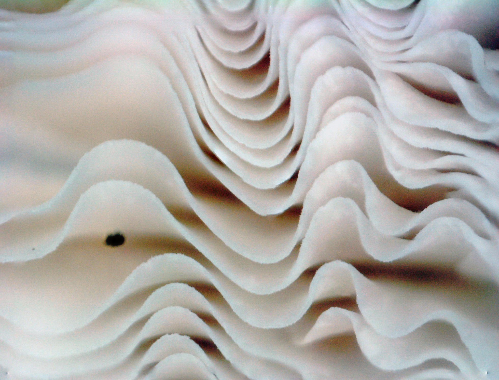 Detalle de las láminas, inicialmente de color blanco algo rosado, para pasar a color marrón chocolate a las pocas horas, por el efecto de la esporada. Láminas libres con respecto al pié, bastante ventrudas.