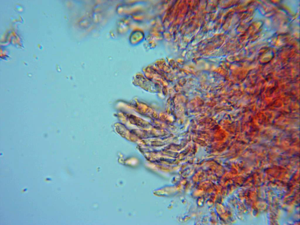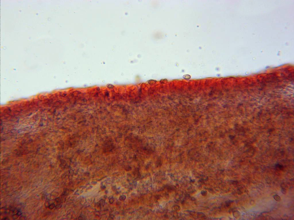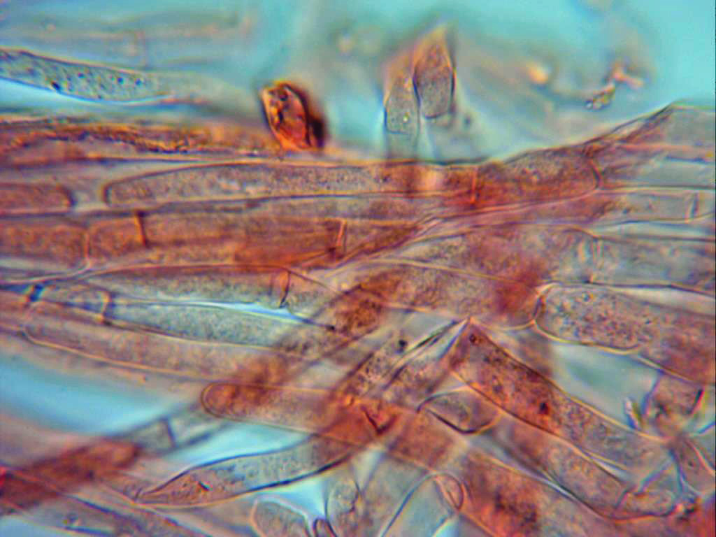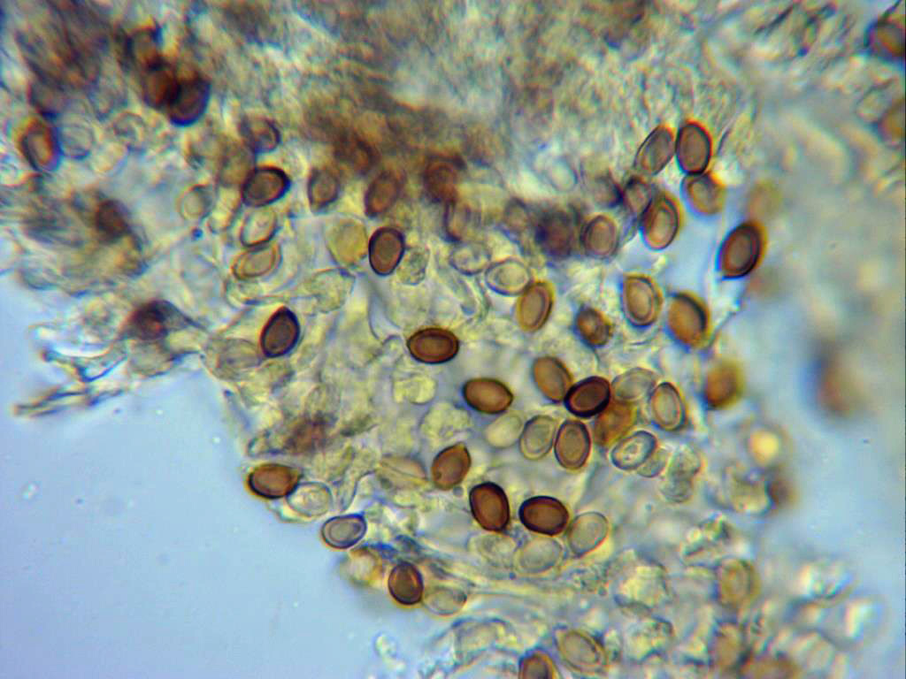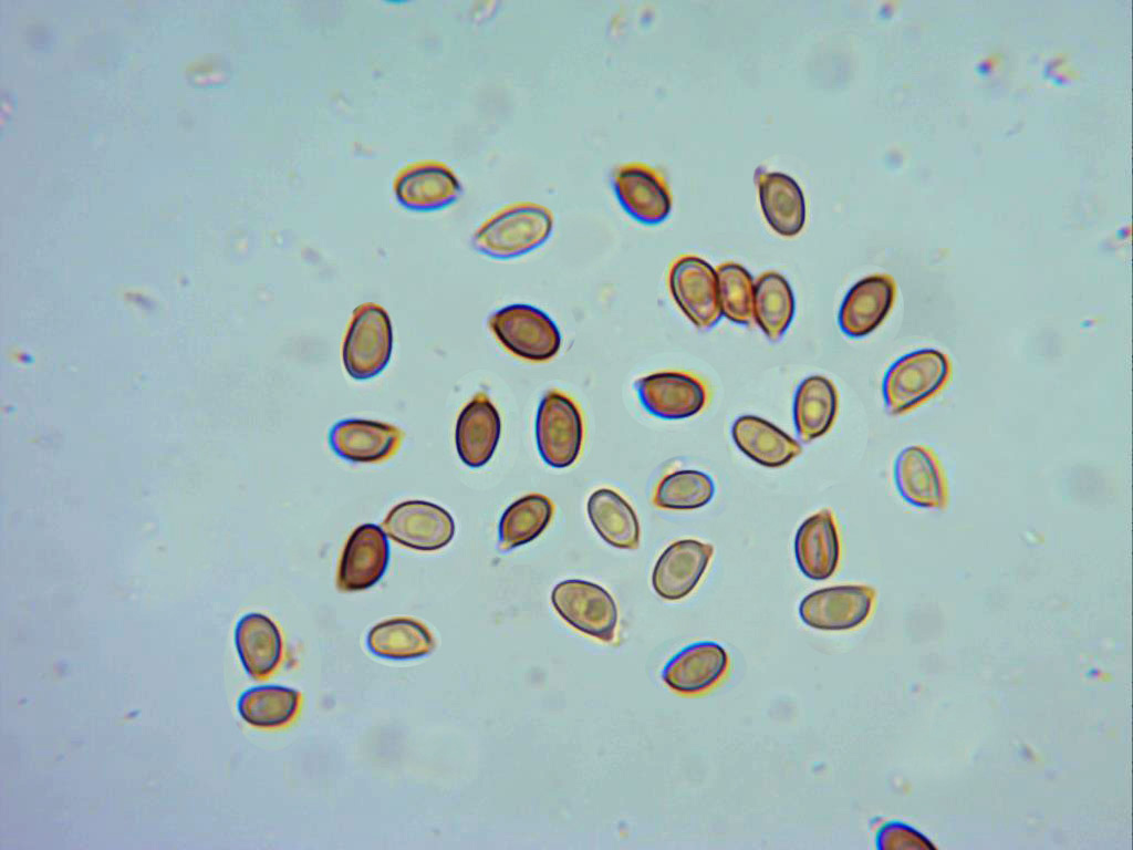 Esporas en solución de rojo congo muy diluido, esporas elipsoidales, con una pequeña apícula descentrada y con gutulaciones en su interior. Las medidas de estas de 5,4 (6,1;6,8) 7,3 X 3,4 (3,7;4,5) 5 micras.