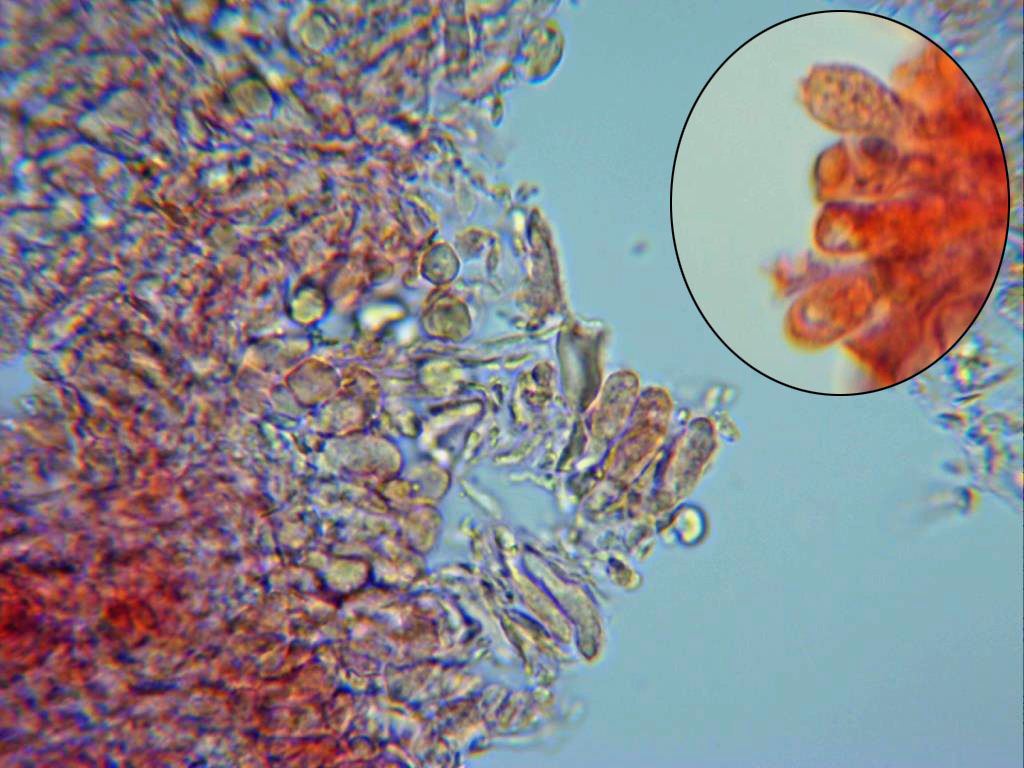 Arista laminar a 400 aumentos, a diferencia de muchos otros Agaricus, el Agaricus porphyrocephalus, presenta una arista laminar fértil, homomorfa, compuesta solo por basidios y basidiolos, sin elementos diferenciados.