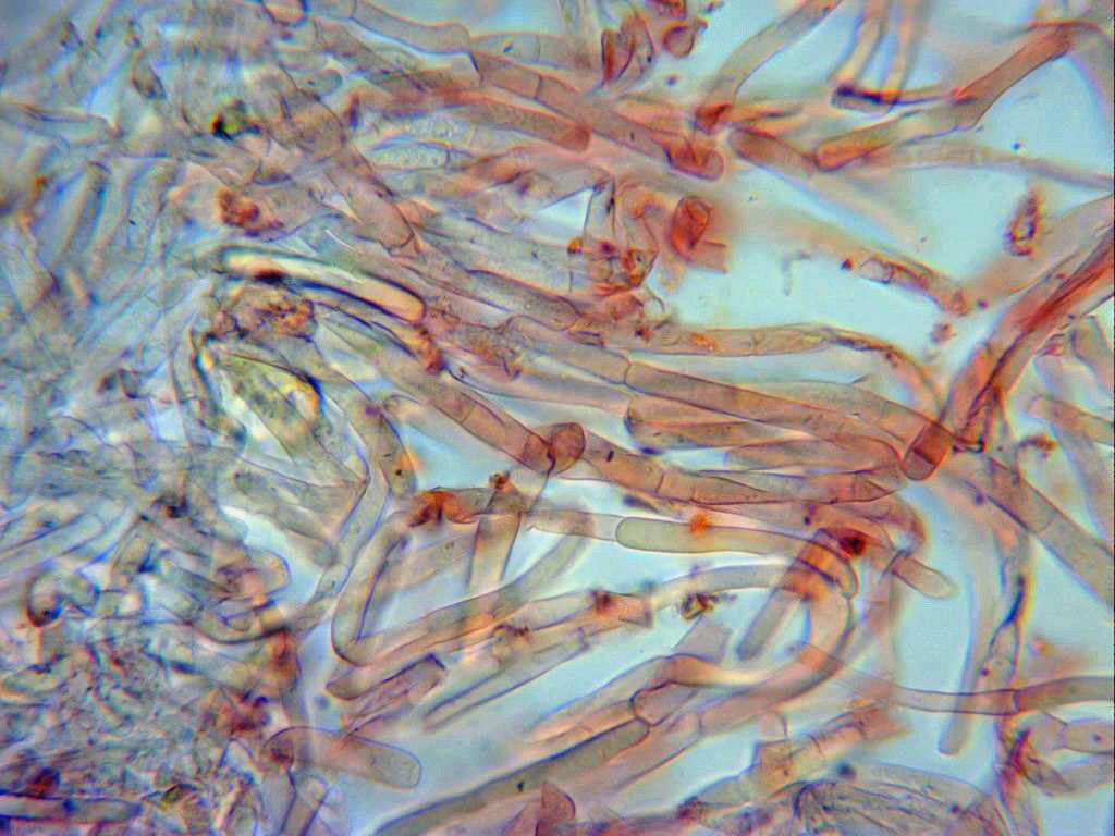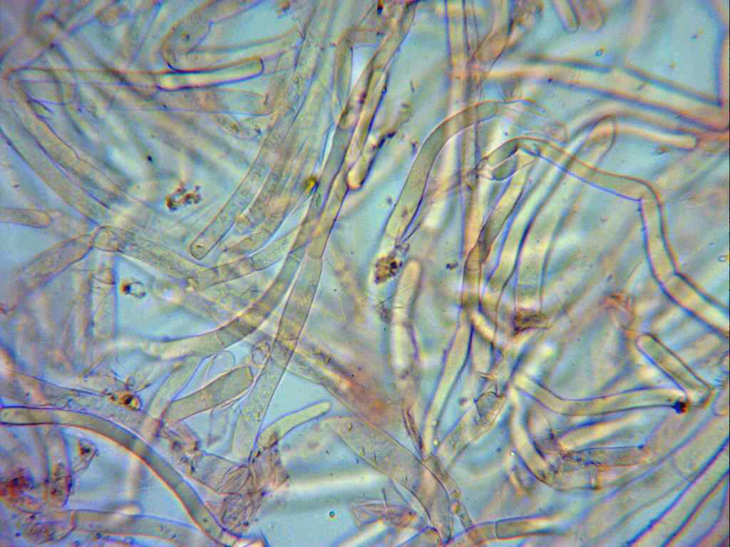 Imágenes de las hifas de la cutícula, a 400 aumentos, muy ligeramente pigmentadas, con septos y desprovistas de fíbulas.