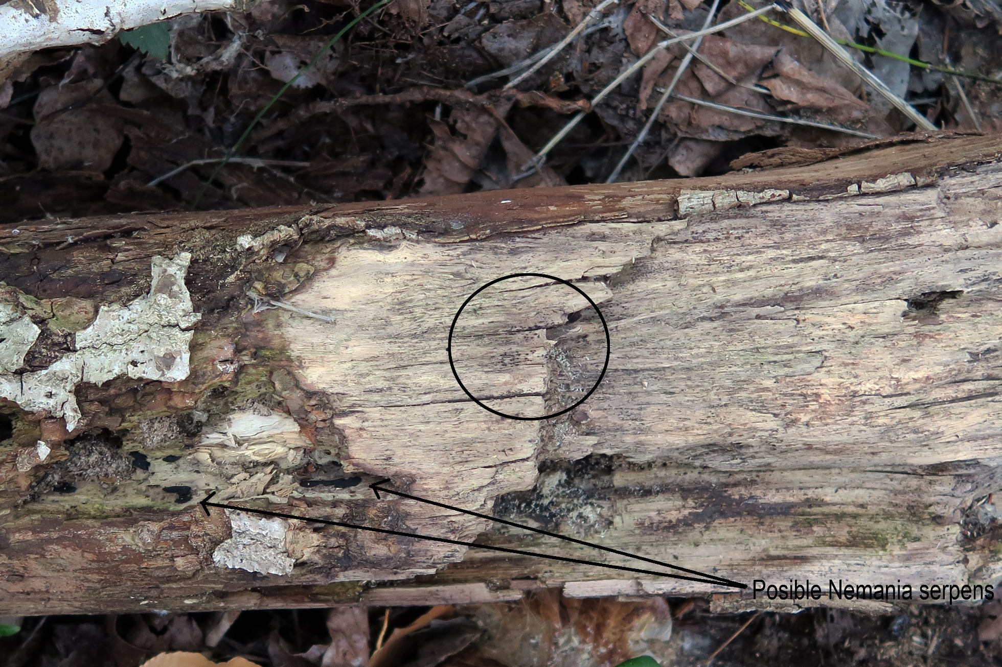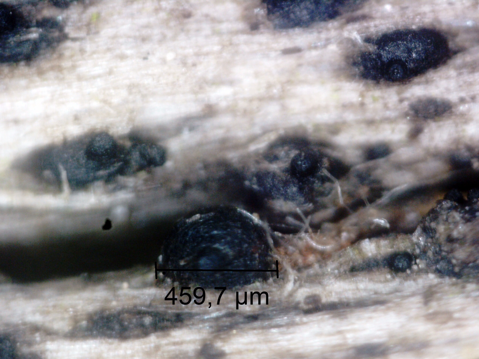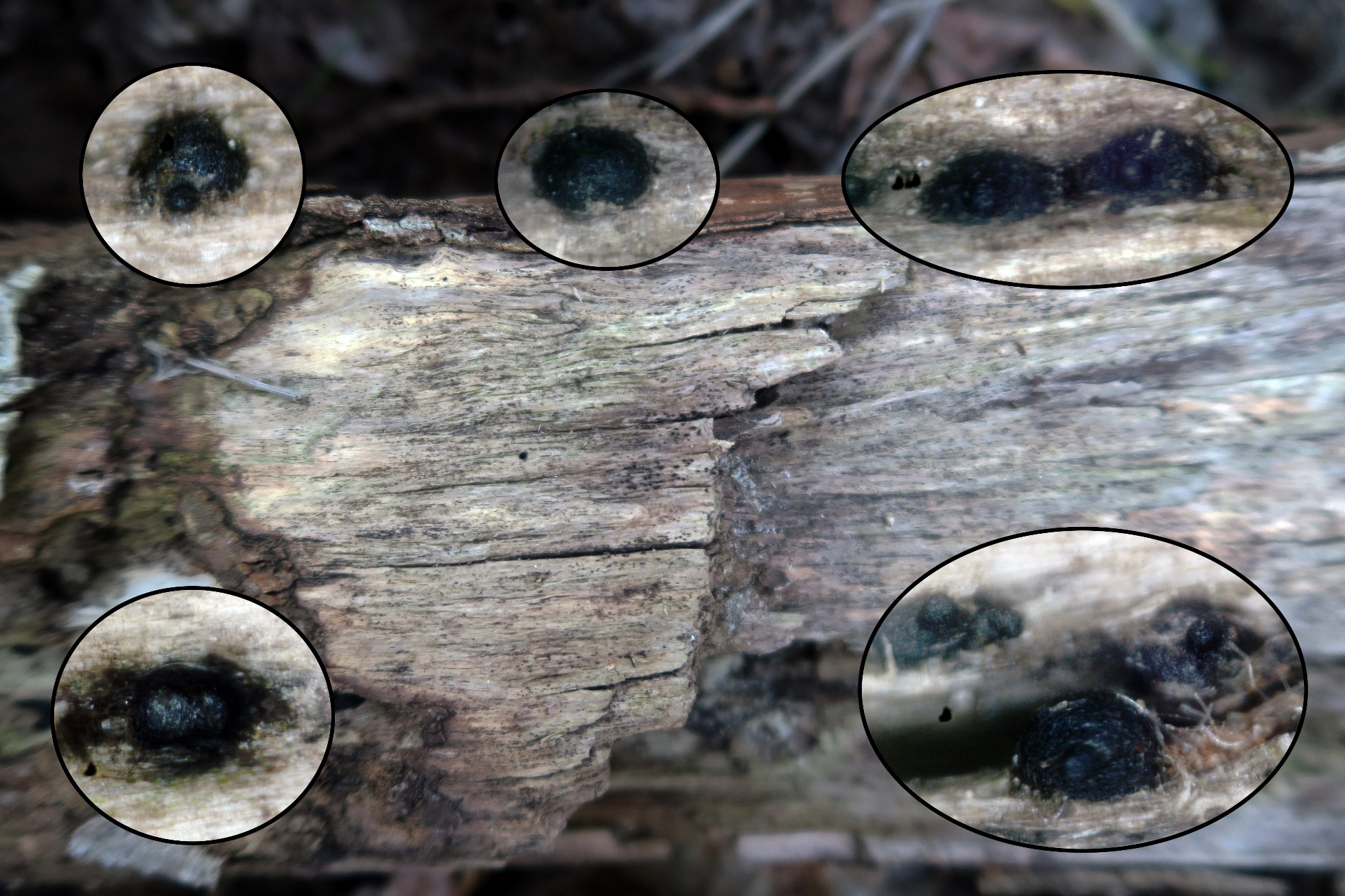 Muy diminutos apotecios por la parte de debajo de un pequeño tronco de planifolio indeterminado, si me apercibí de su presencia fue solo por encontrar unos pequeños estromas de una posible Nemania serpens (punto aún sin confirmar, ya que está pendiente de micro), a pocos cms. de esta se hallaban los pequeños apotecios marcados en la imagen.