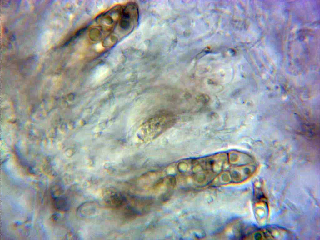 Himenio con ascas y paráfisis a 400 aumentos, las medidas de las ascas de 63,4;87,3 X 9,2;11,9 micras.
