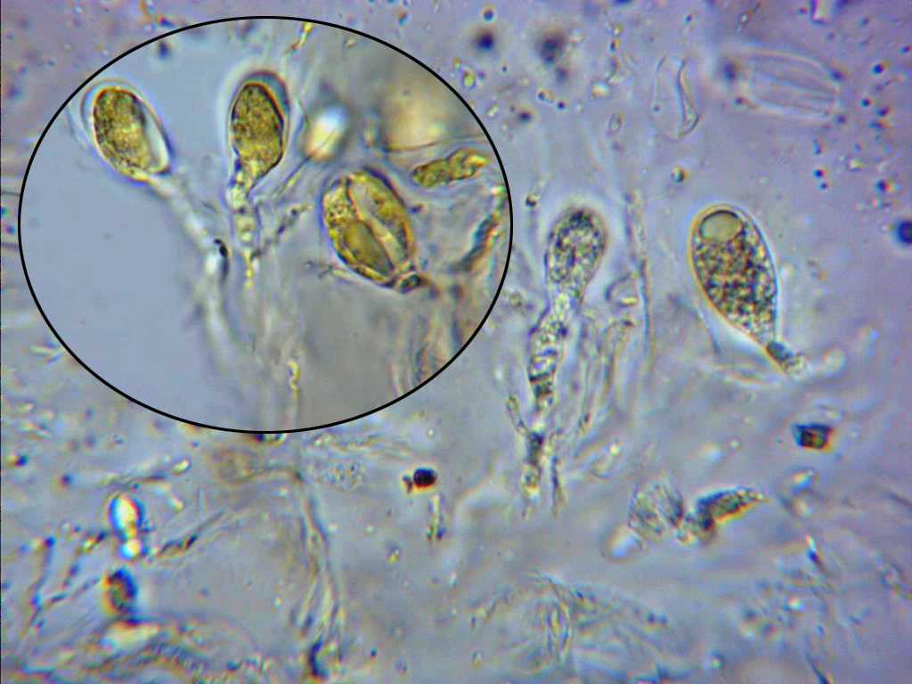 Detalle de la base de los basidios en agua destilada y en la miniatura en Reactivo de Melzer.