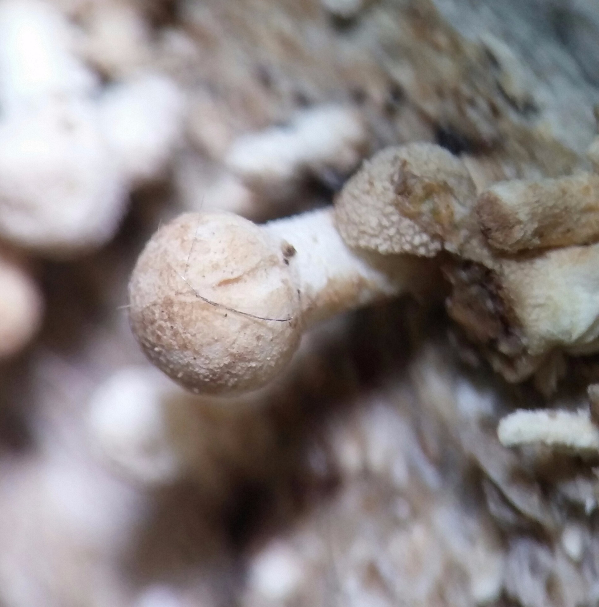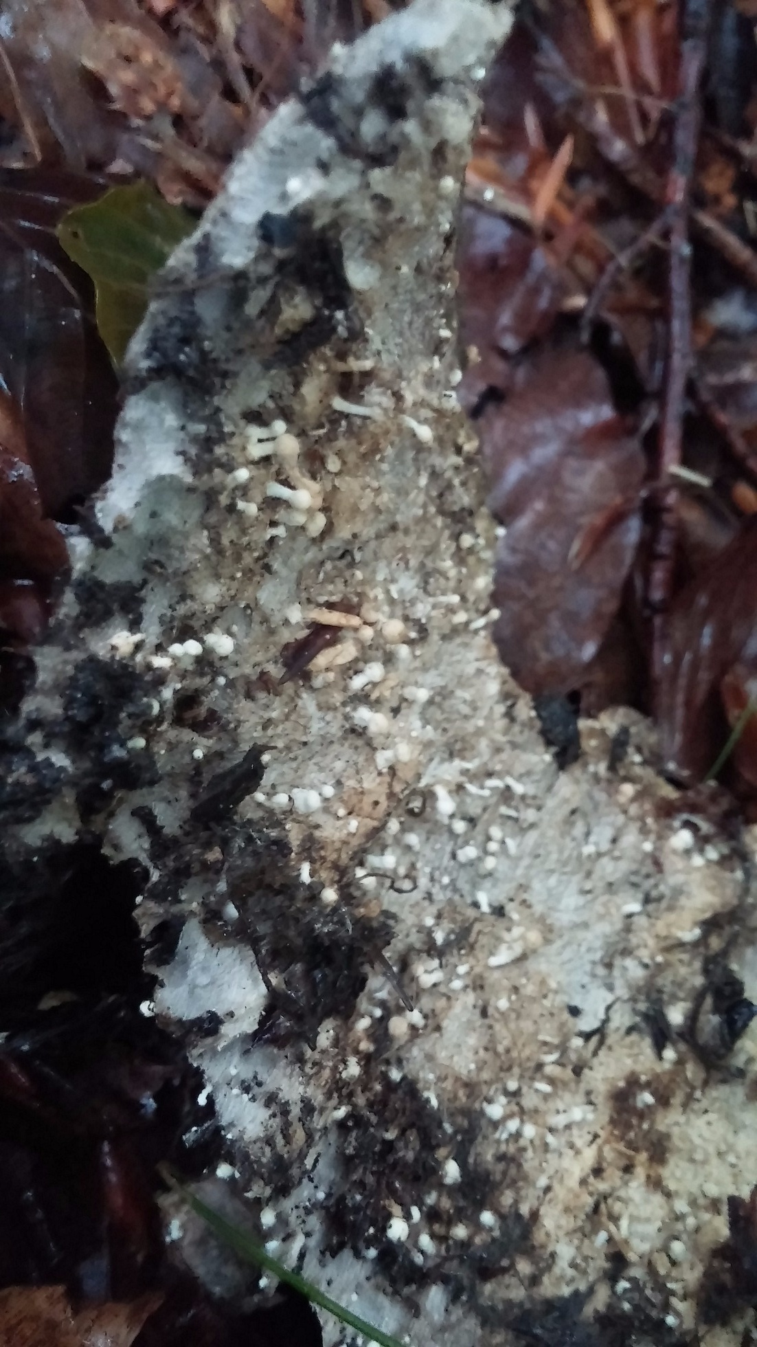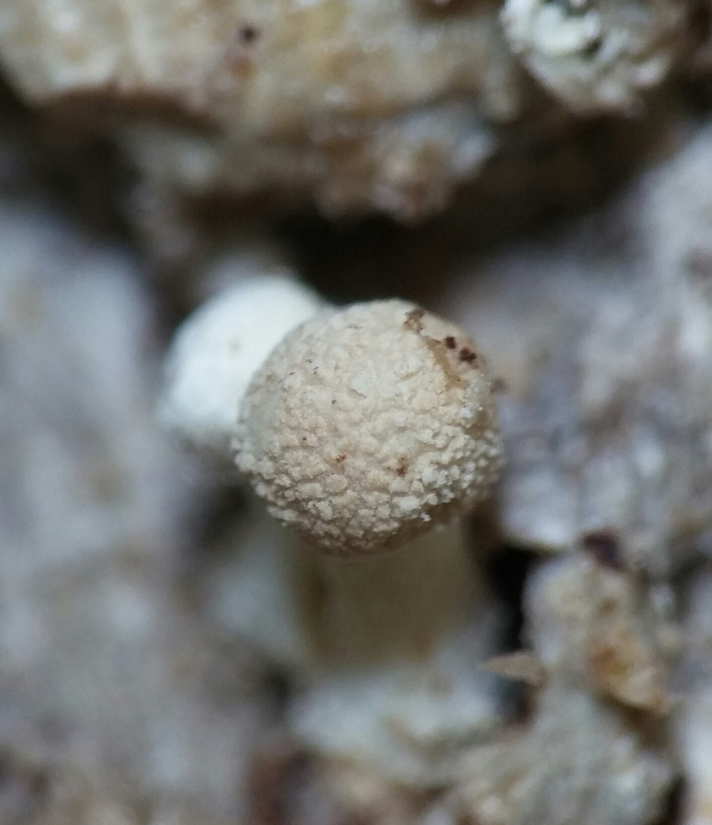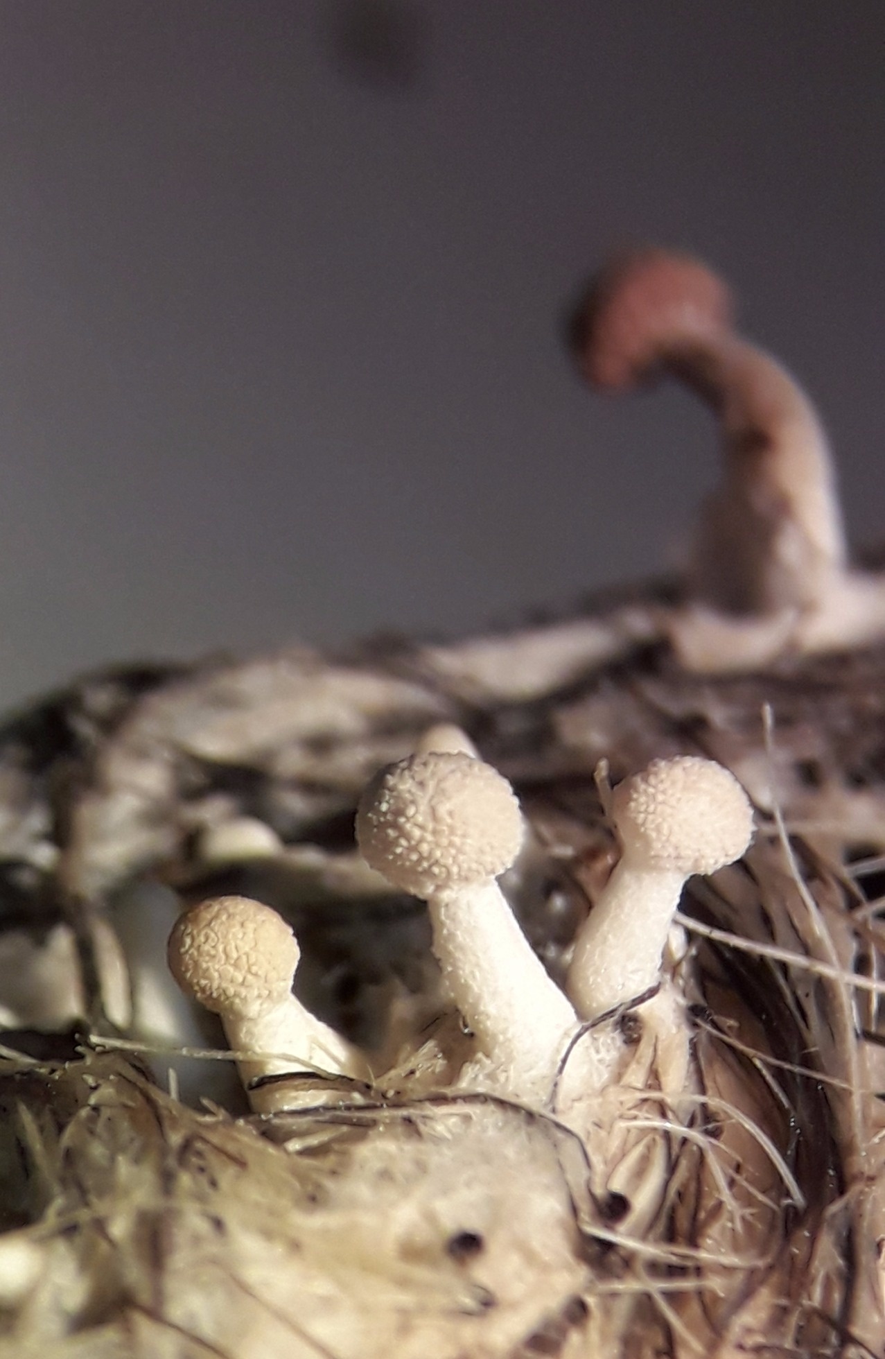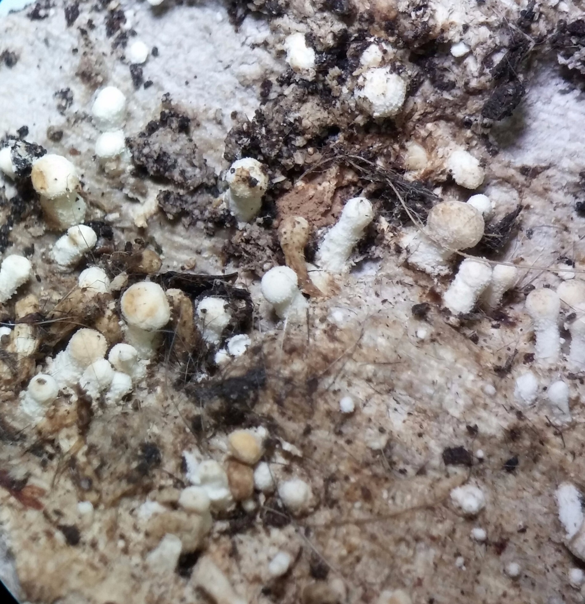 aquí vemos en detalle los carpóforos, más pulverulentos según la bibliografía (detalle difícil de apreciar), con el pie alargado, recurvado y atenuado hacia el ápice