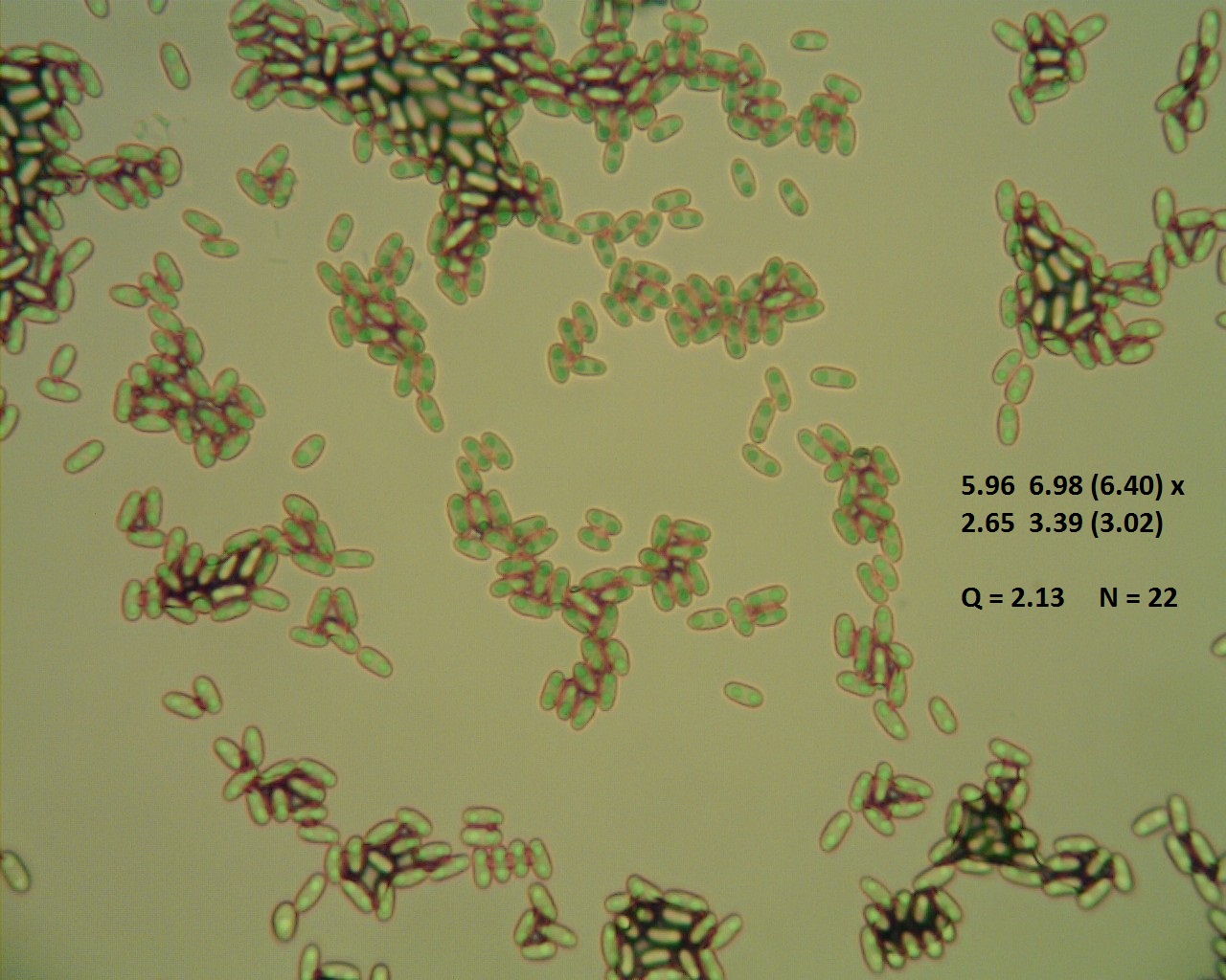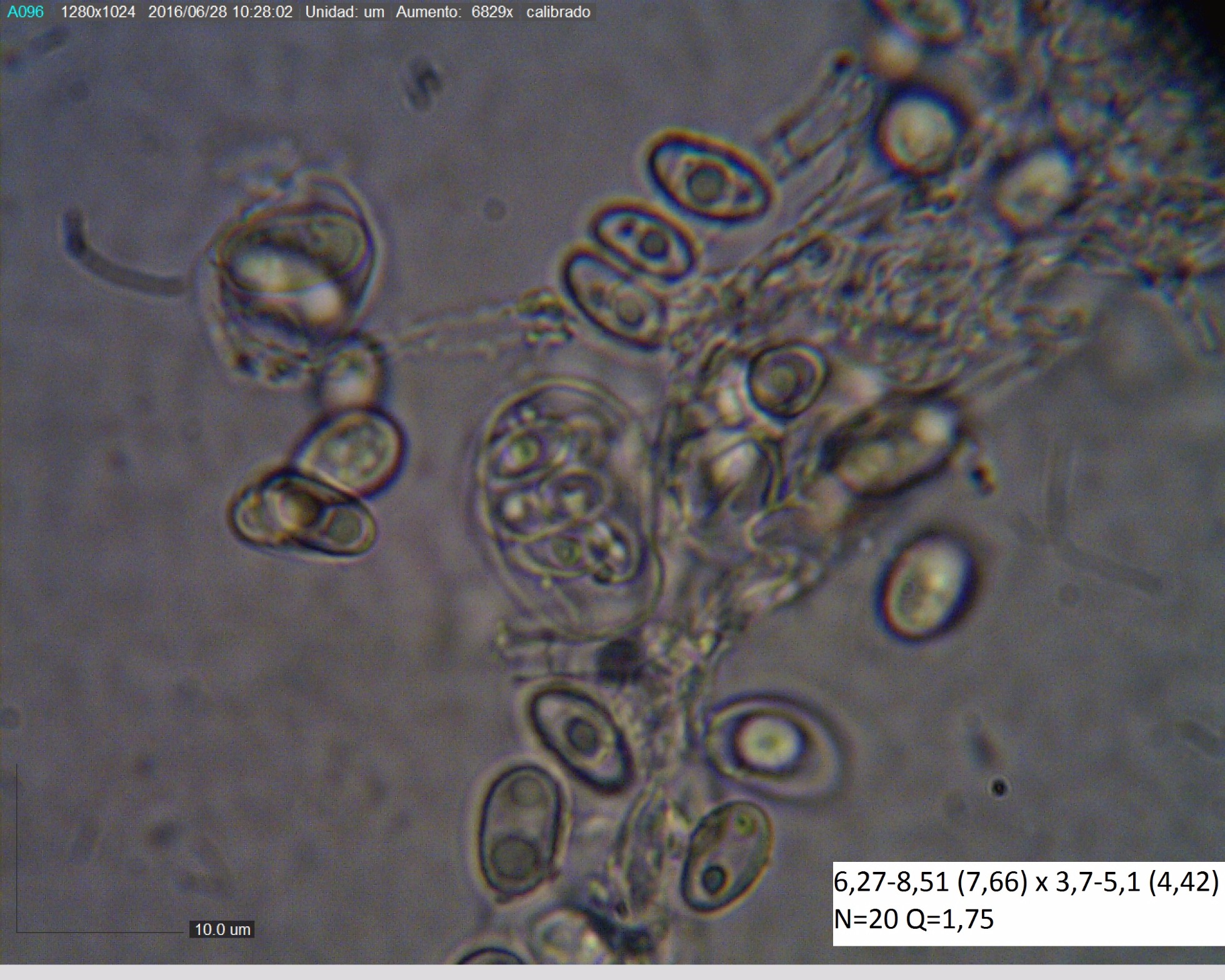 las esporas son también bigutuladas, más estrechas que las de su compañera y por tanto con una Q mayor