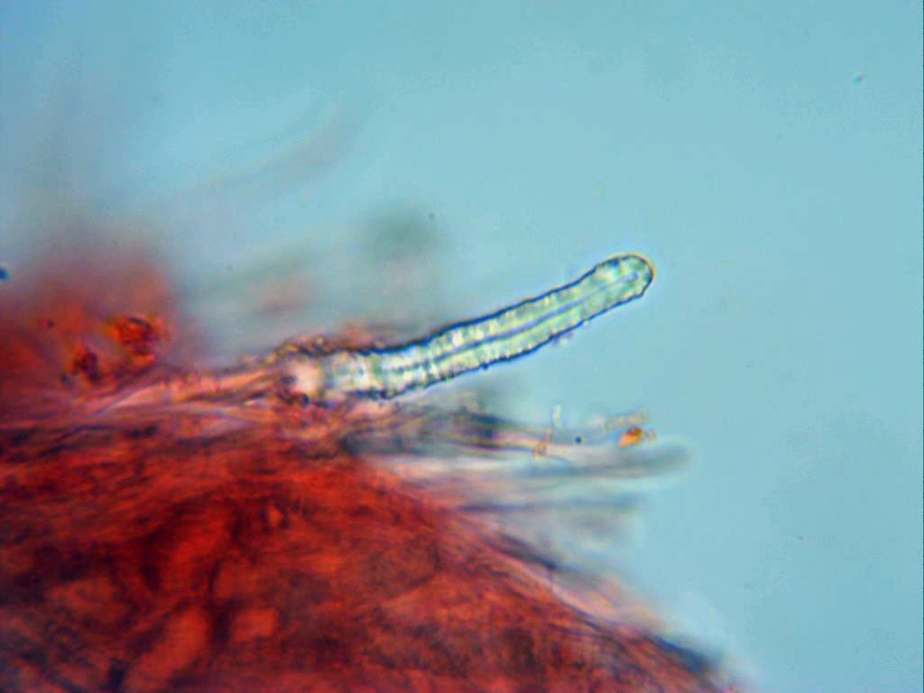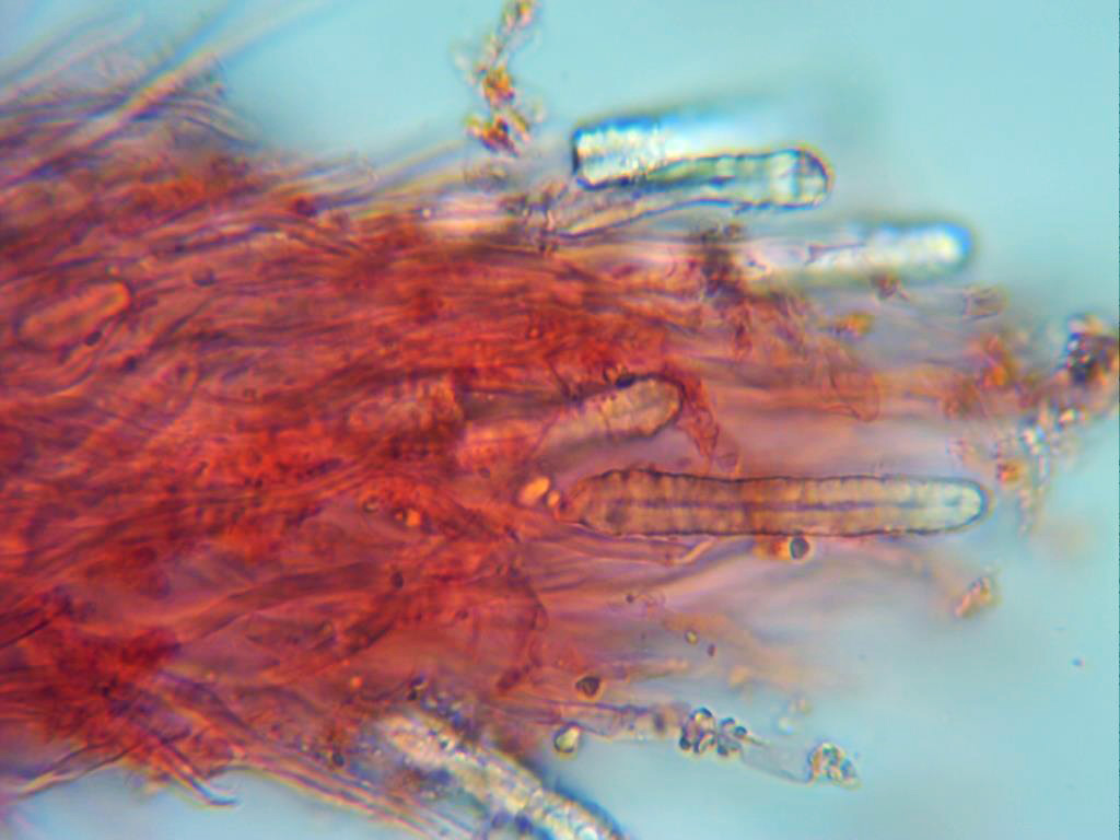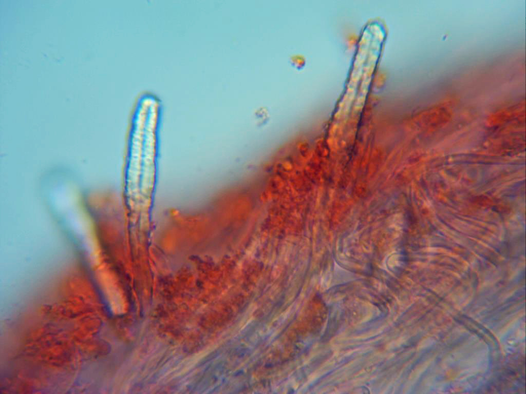 Cistidios muy abundantes con incrustaciones cristalinas y de pared gruesa.