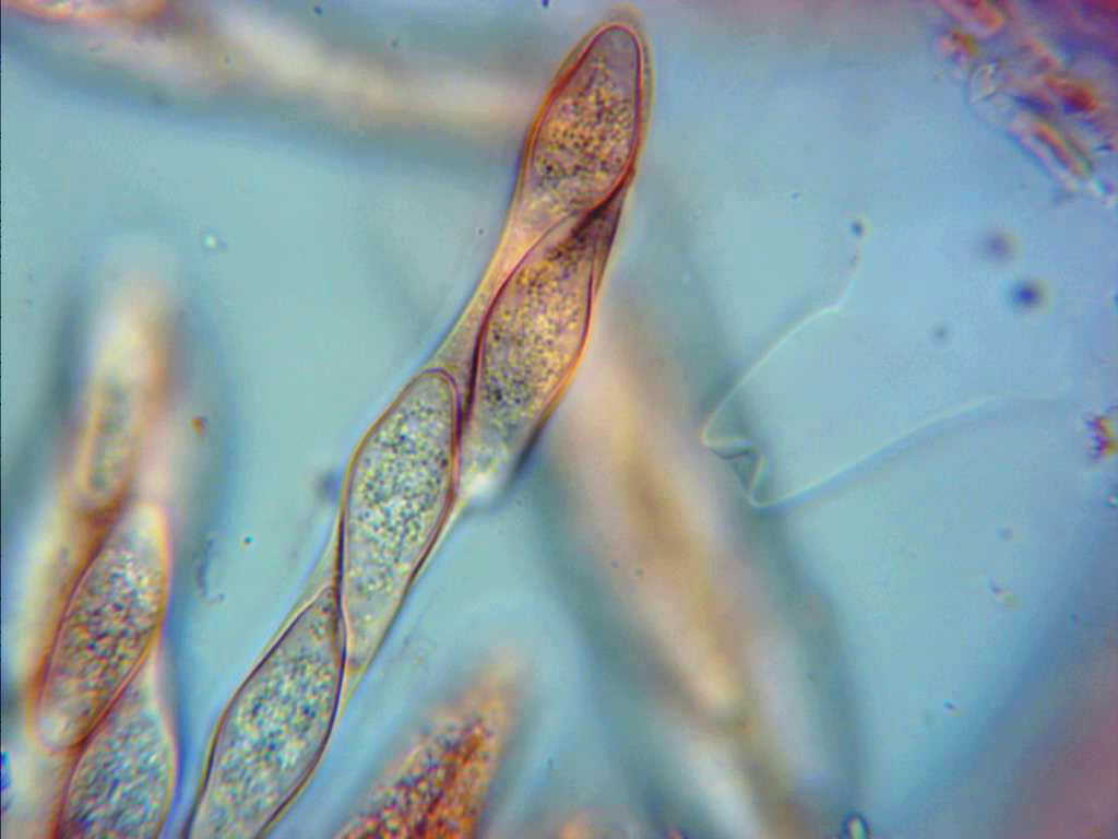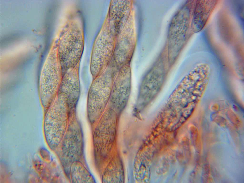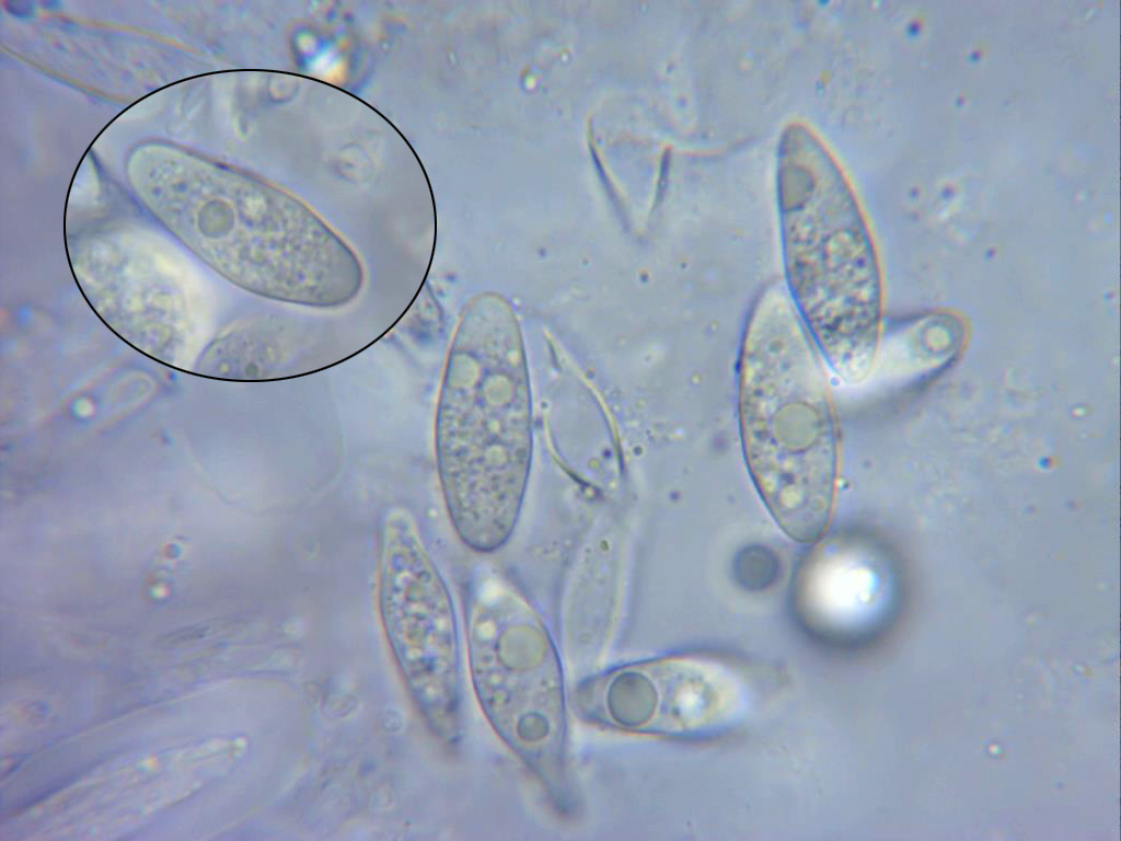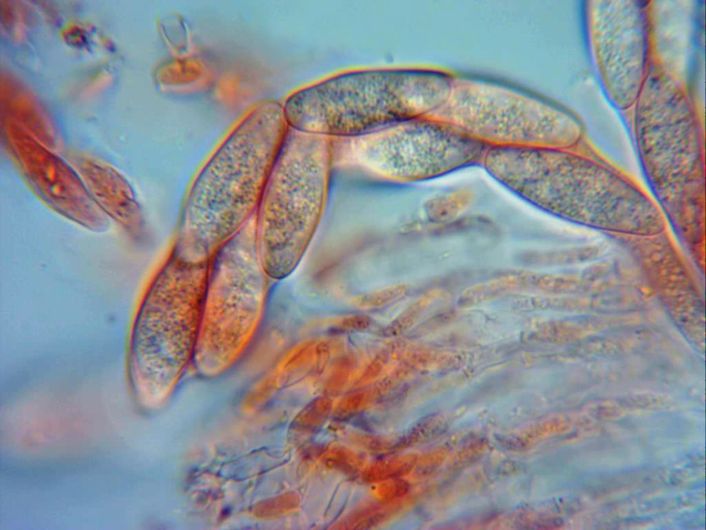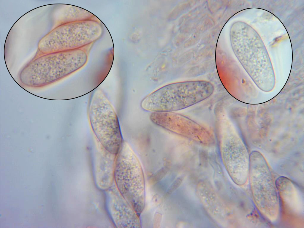 Ascosporas en Rojo Congo diluido. Ascosporas elipsoides, hialinas, de pared fina, estrechándose en los extremos (ligeramente cónicas). En mis mediciones de 25,9;30,8 X 10,2;11,5 µm.