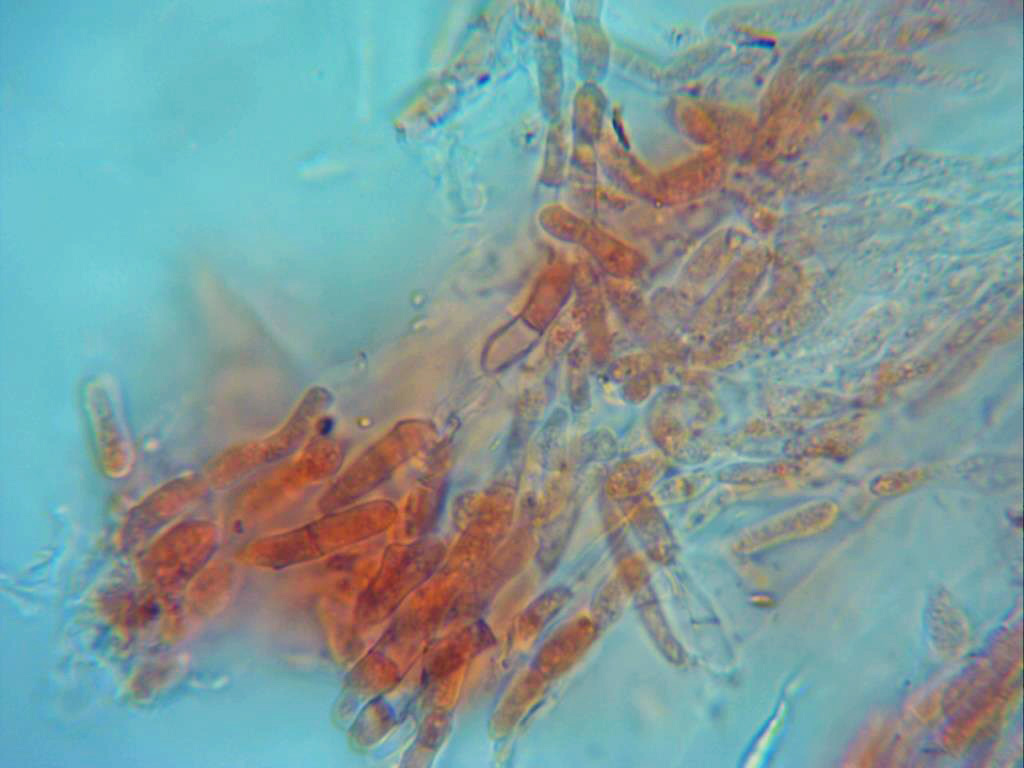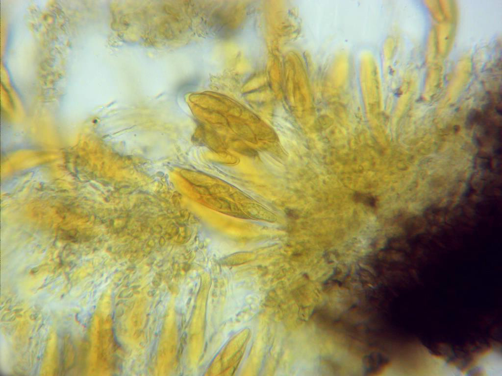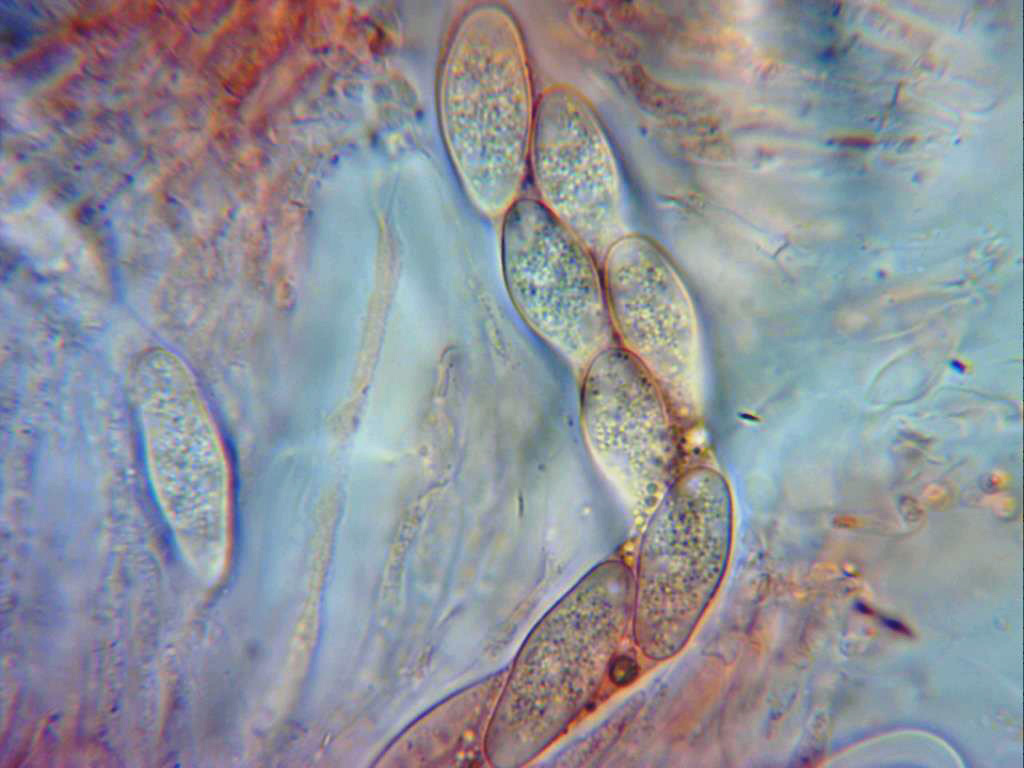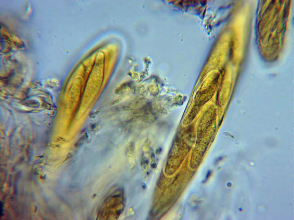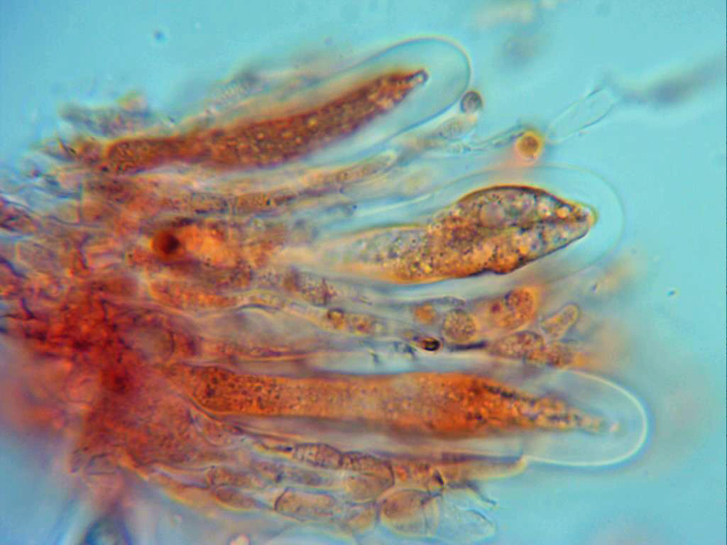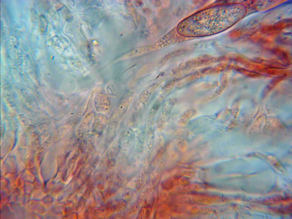 Ascosporas en Rojo Congo diluido. Ascosporas elipsoides, hialinas, de pared fina, estrechándose en los extremos (ligeramente cónicas). En mis mediciones de 25,9;30,8 X 10,2;11,5 µm.