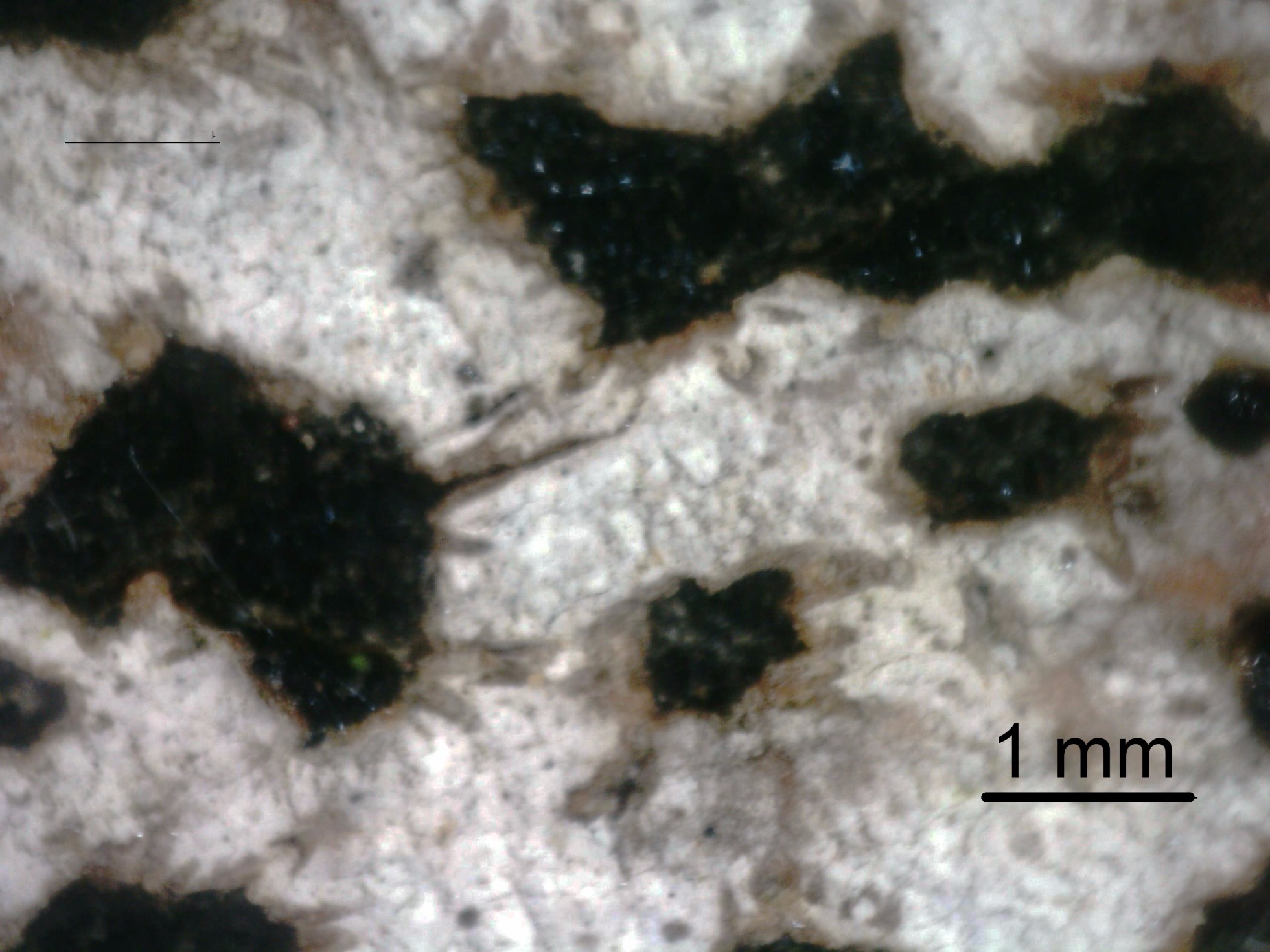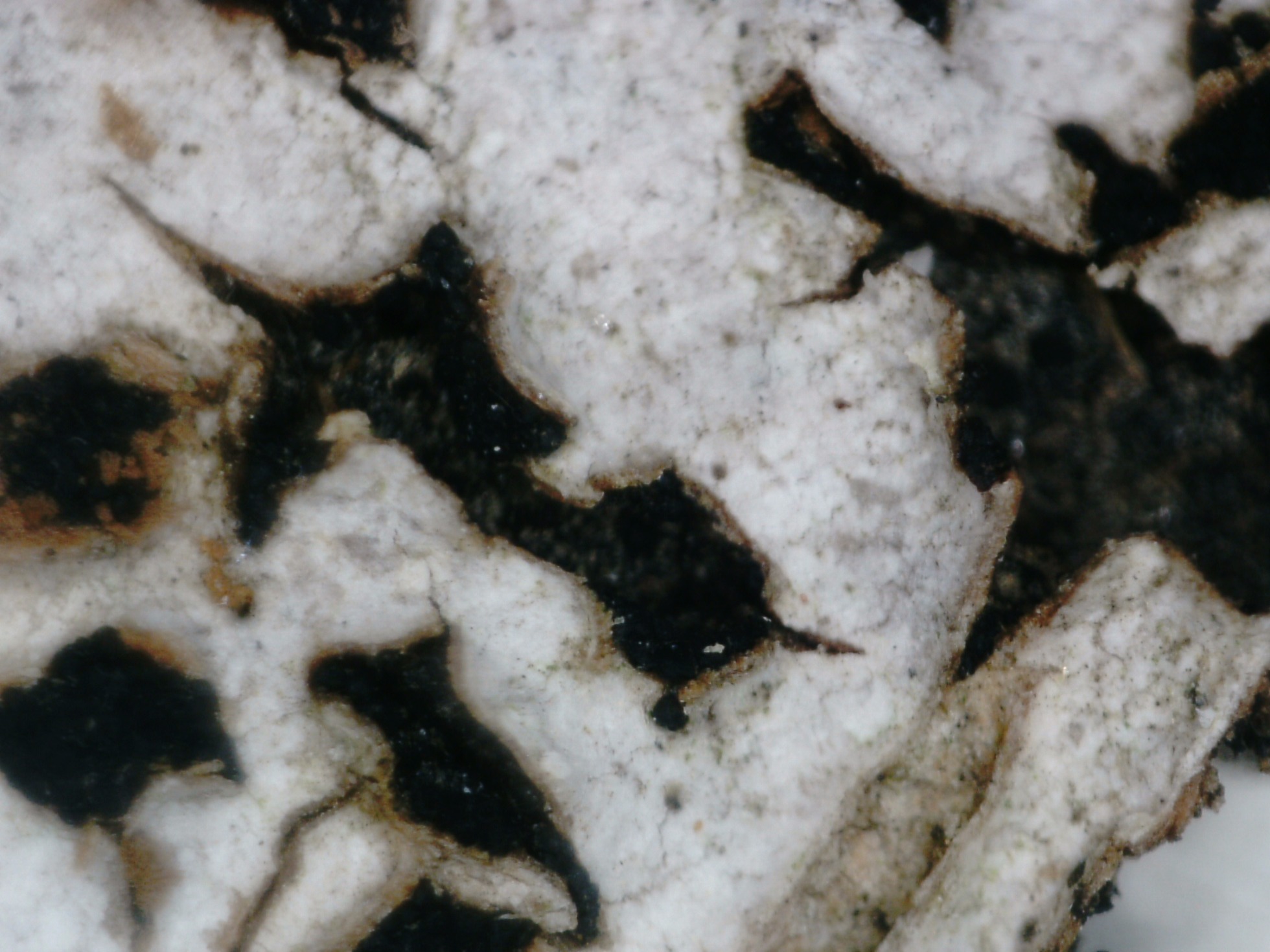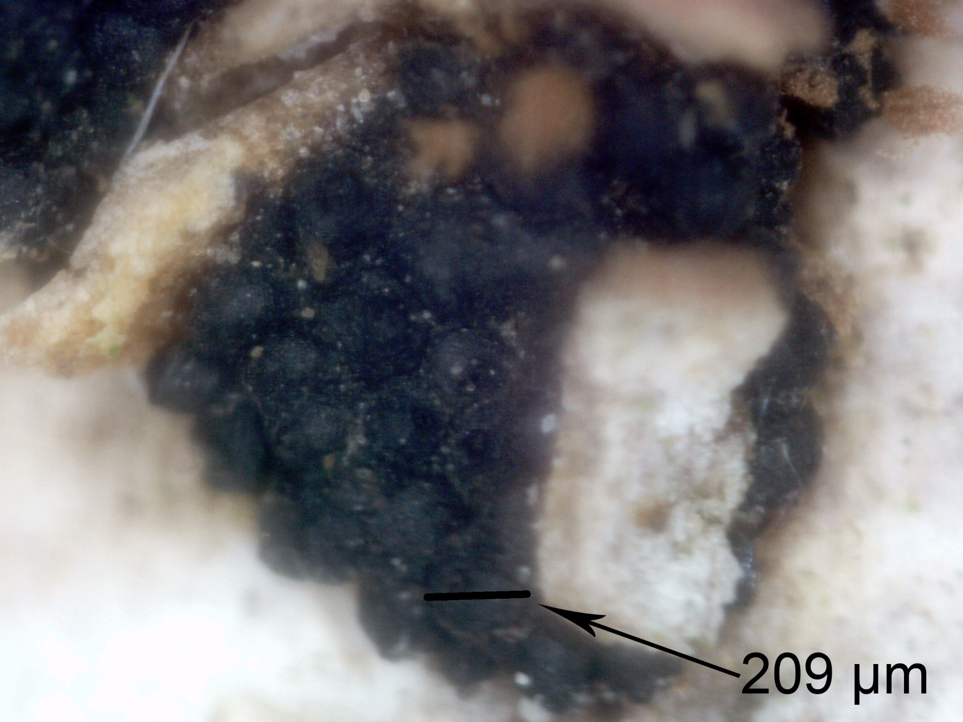 Una imágen del mismo a 100 aumentos, se aprecia en la sección del mismo unos puntitos de color blanco brillante que corresponden al interior de los ascomas, la base asimismo presenta un color blanquecino. Se puede apreciar el pequeño tamaño de los ascomas de tan solo 0,2 mm.