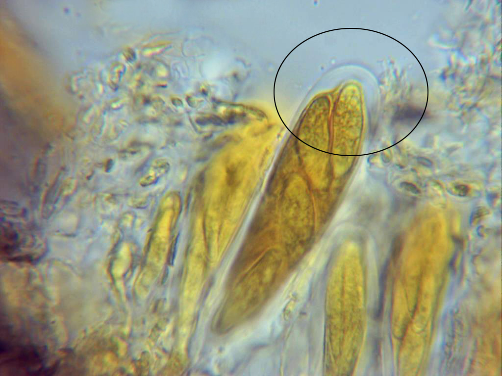 Detalle de un asca asimismo en reactivo de Melzer donde se aprecia bien la cámara apical en el extremo de la misma, este detalle lo he querido remarcar en el círculo.