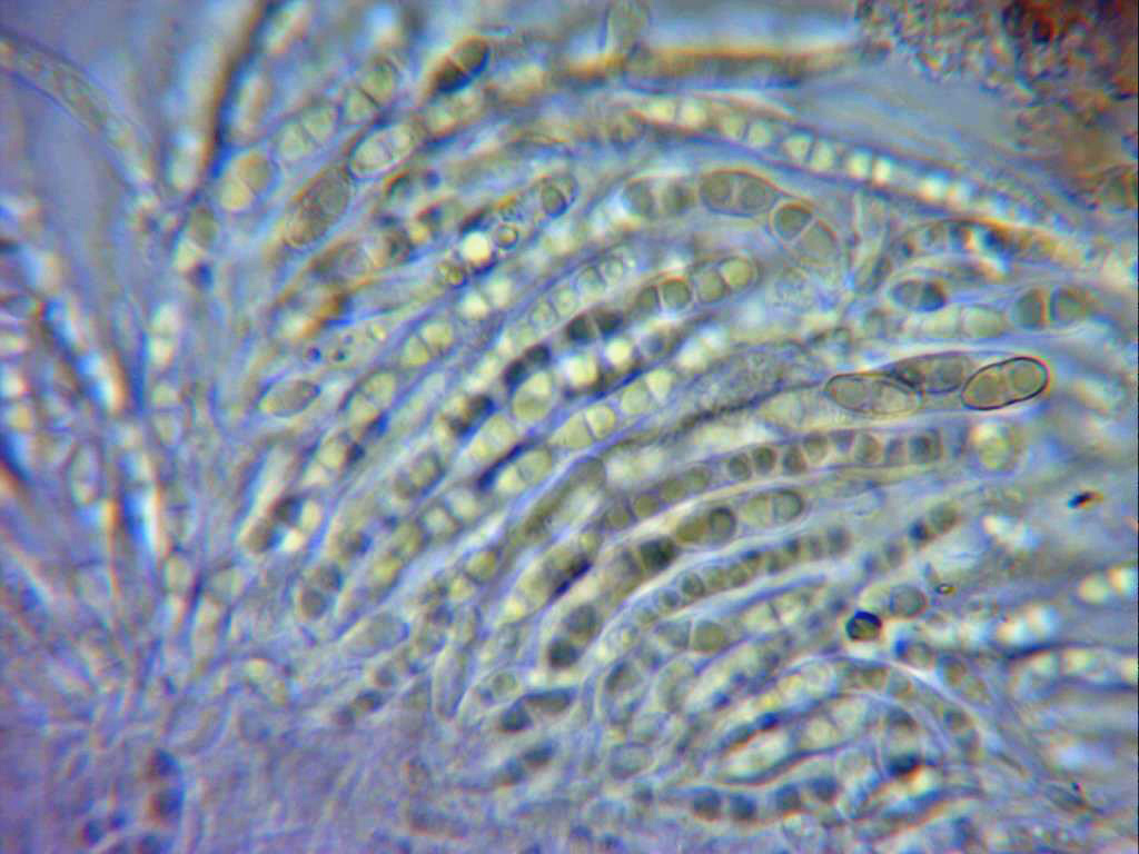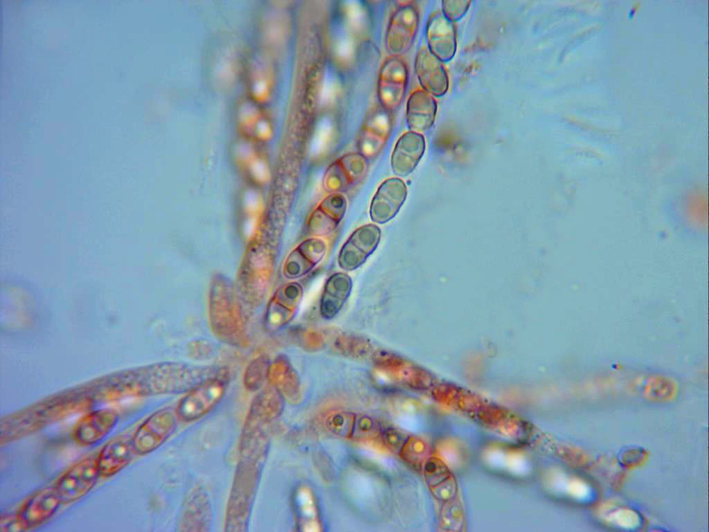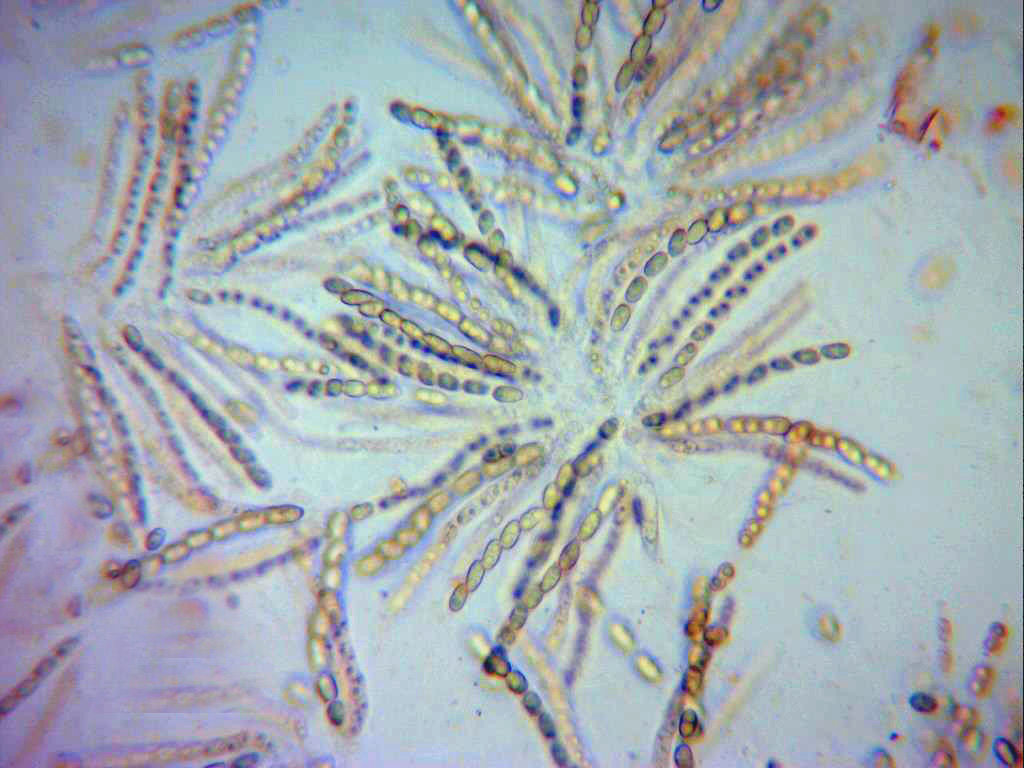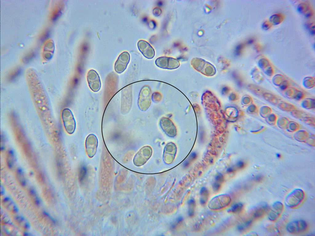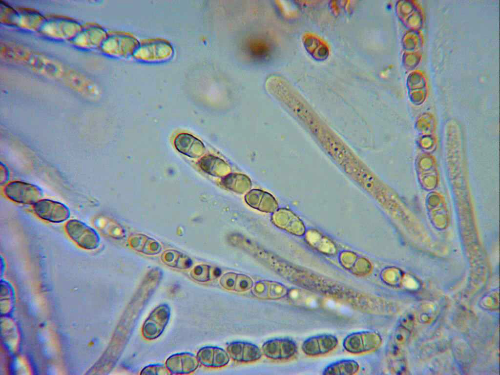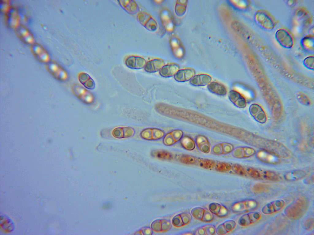 Las ascosporas, elípticas, septadas y bigutuladas, se puede apreciar en el septo un ligero estrangulamiento, la pared de estas muy timidamente rugosa.