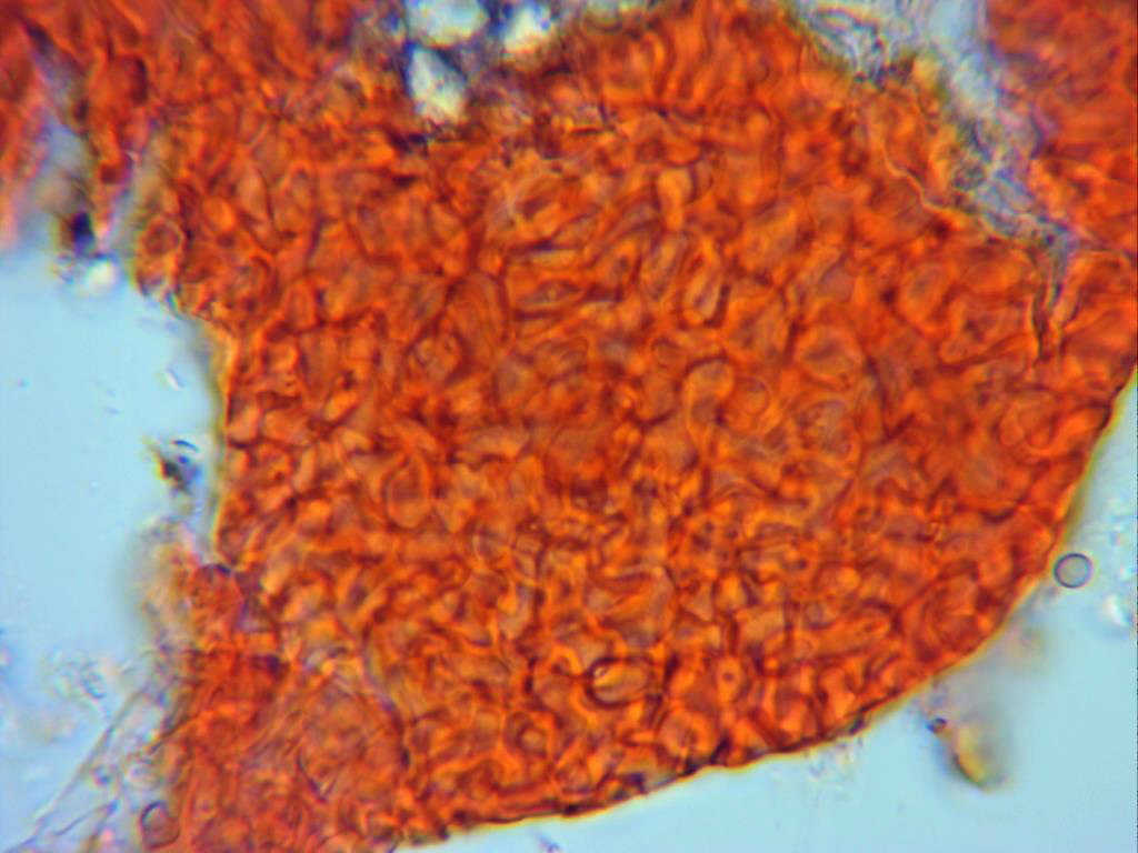 Pared exterior del peritecio con hifas fuertemente incrustadas de un color anaranjado.