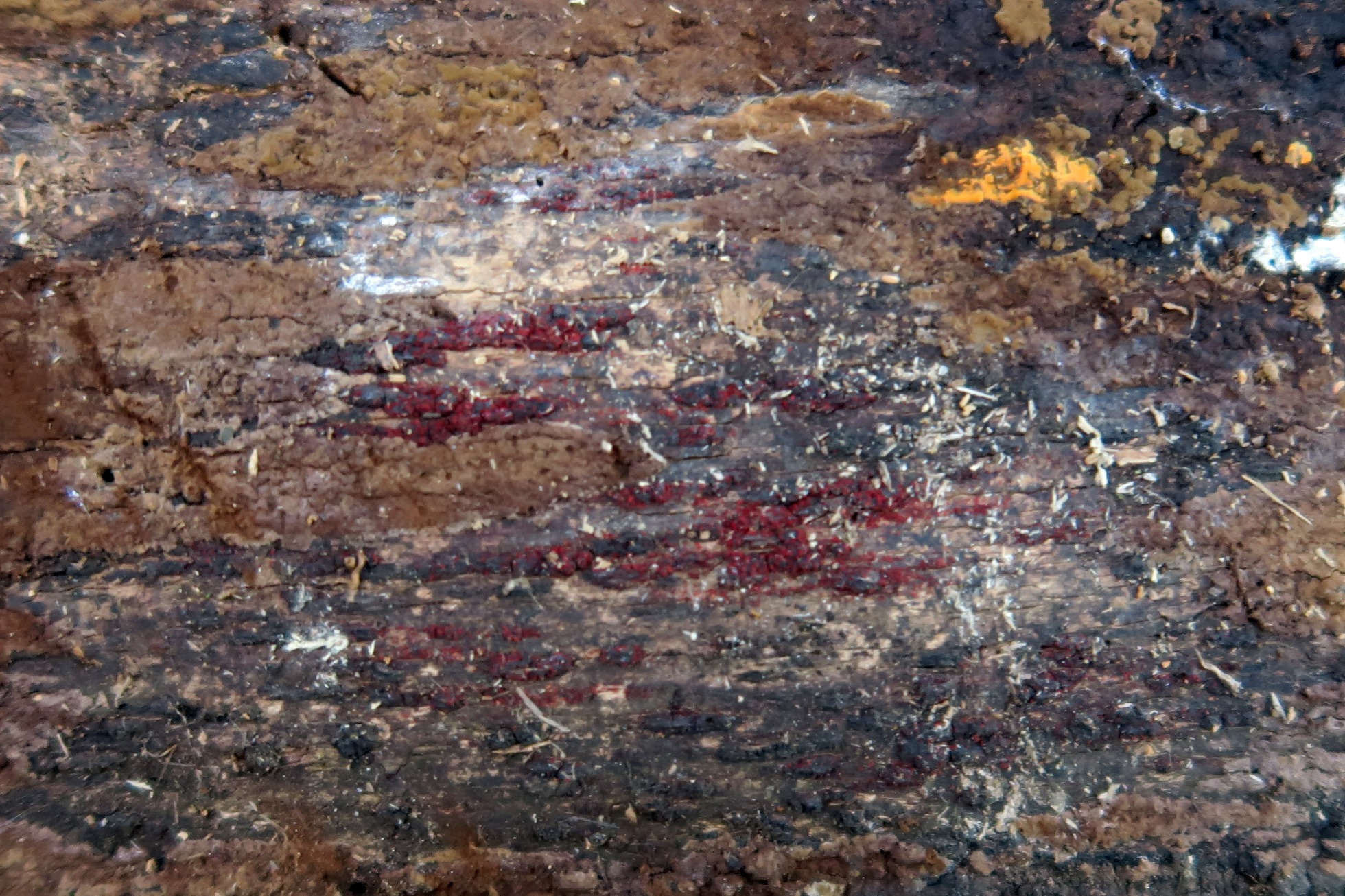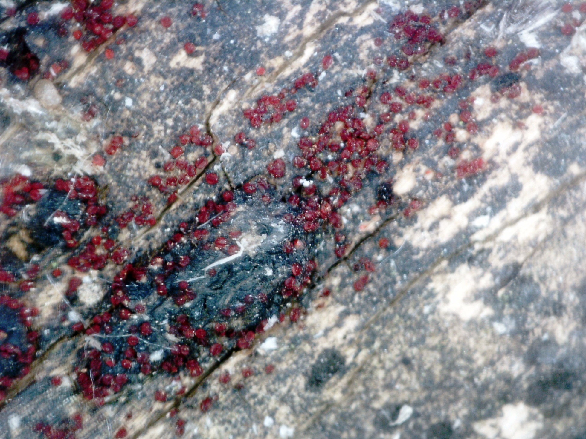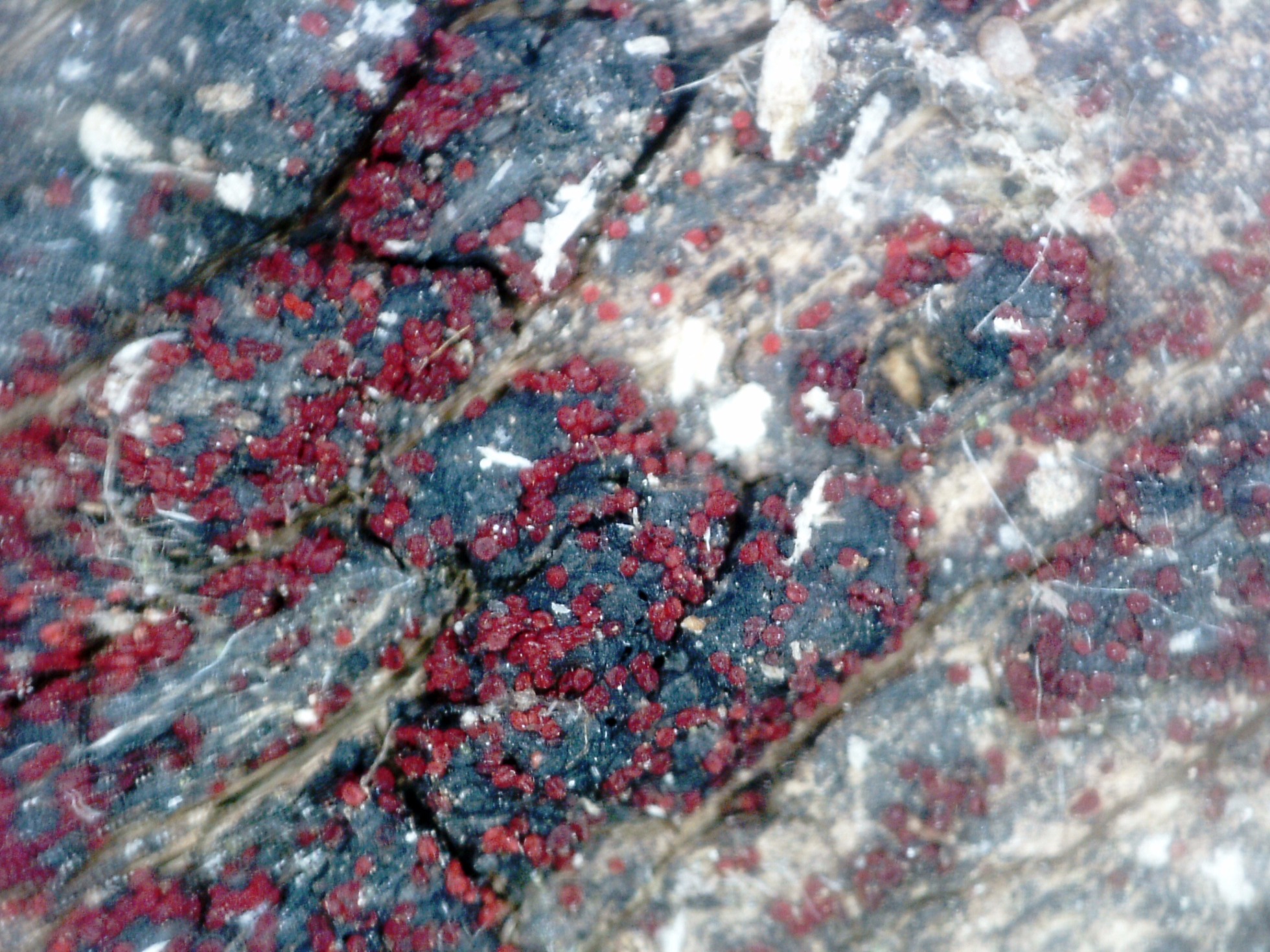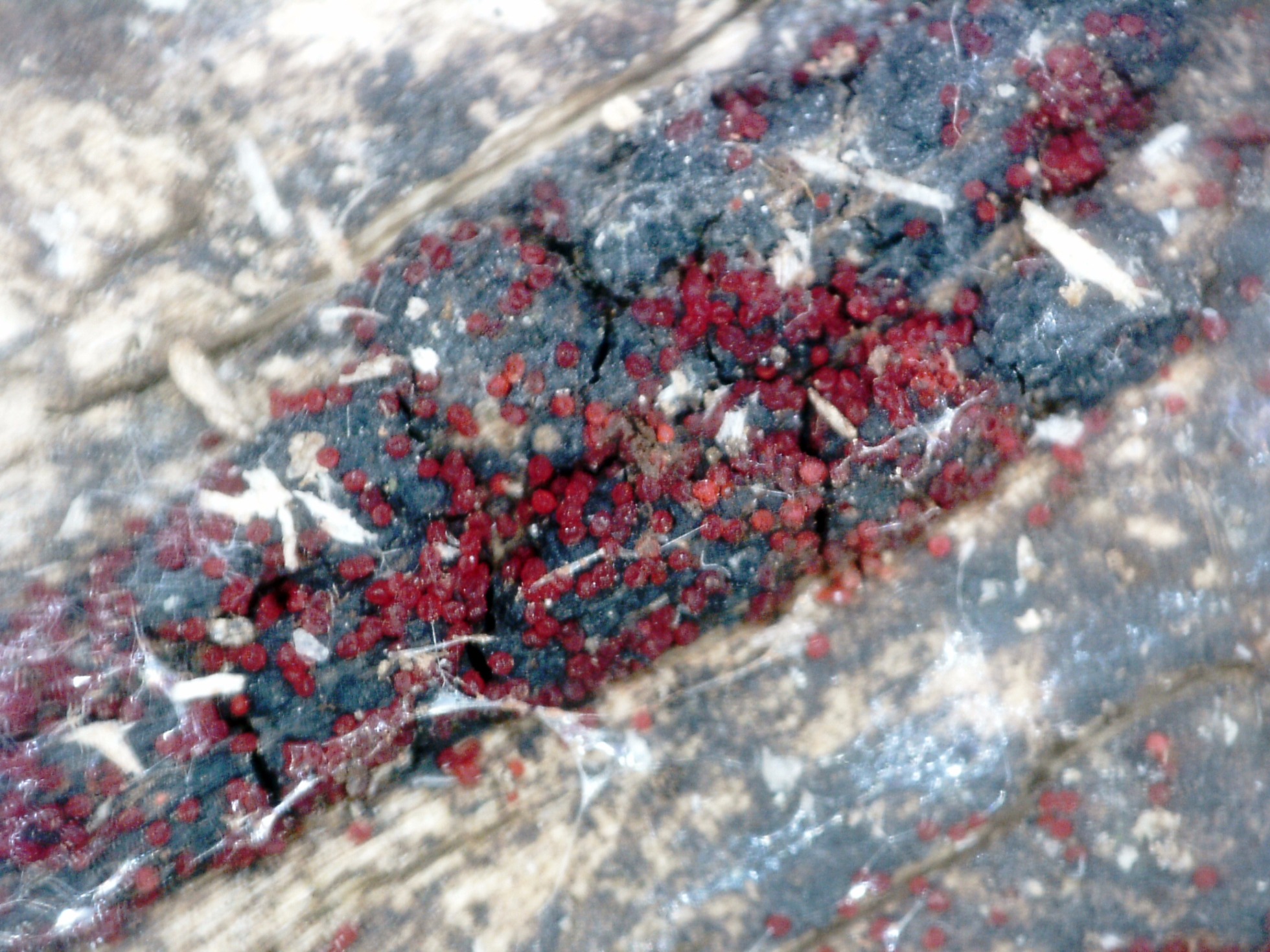 Muy diminutos apotecios de color rojizo, parasitando un Pirenomiceto, por la zona abunda la Eutypella scoparia, aunque tampoco descarto un Diatrype.