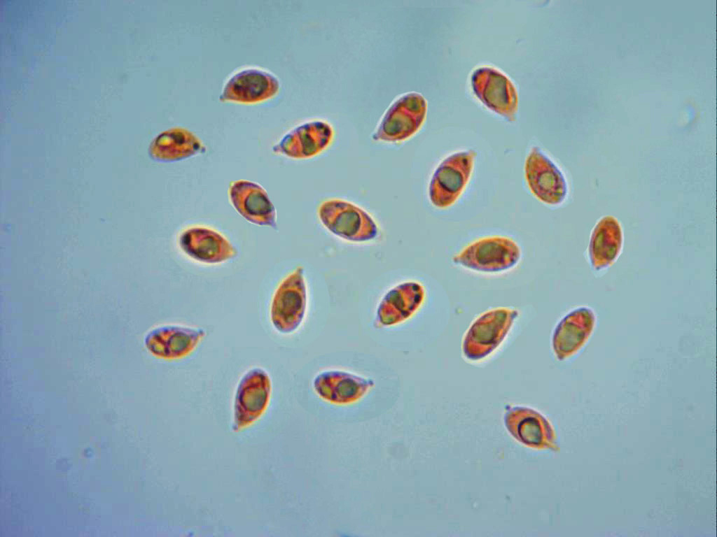 Esporas entre elipsoides y amigdaliformes, con una marcada apícula algo lateral y con una vacuola y granulaciones en su interior, congófilas, inamiloides e hialinas en reactivo de Melzer.