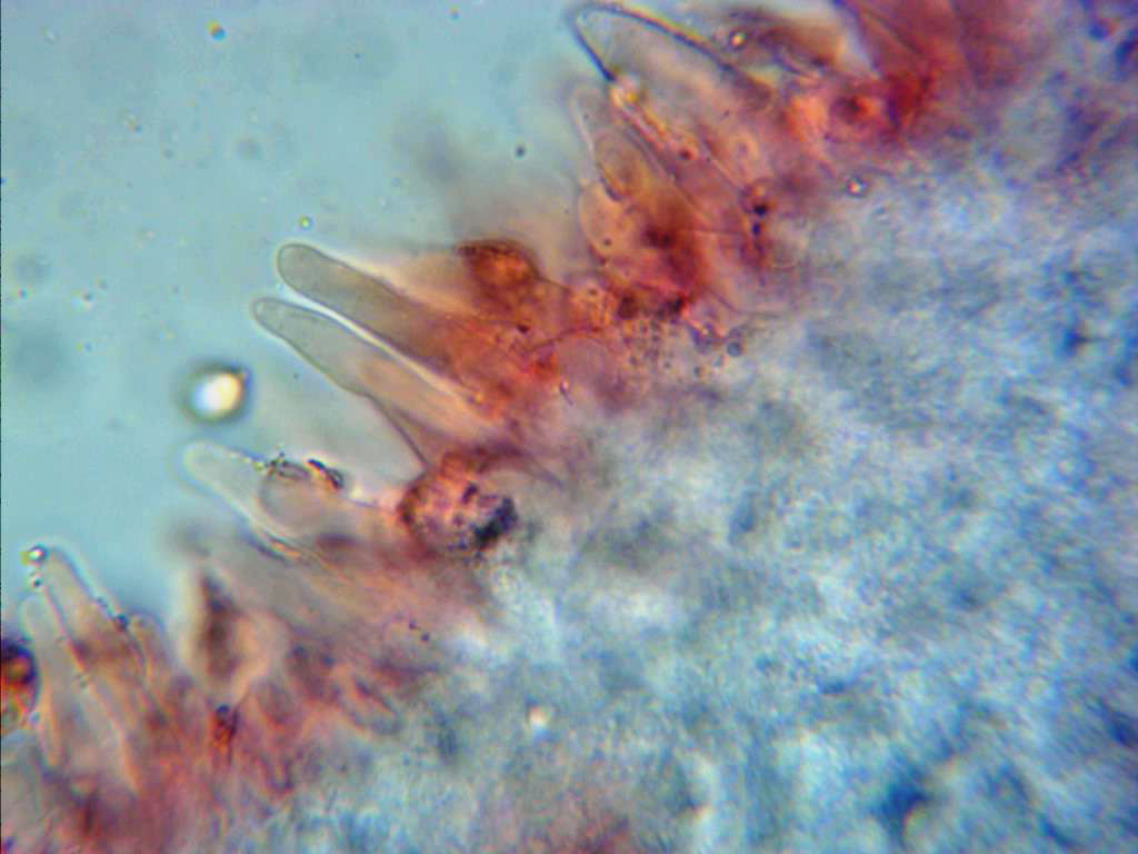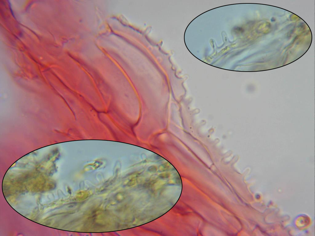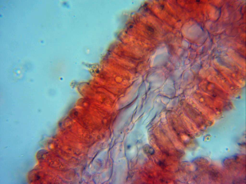Detalle de las excrecencias de la superficie de la pileipellis, de muchas muestras preparadas solo pude observar las de la imágen, en las miniaturas las mismas en reactivo de Melzer. Las medidas de las excrecencias de 1,4 a 2 µm de ancho por 3,4 a 9,5 µm de alto, no pude observar ninguna de estas con ramificaciones.