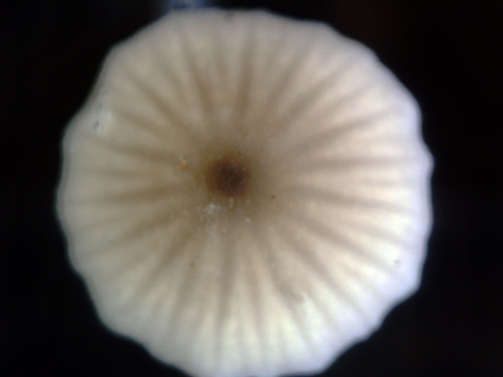 Una pequeña Mycena, brotando sobre restos leñosos, solo 2 ejemplares, sombrero de unos 6 mm. , convexo, algo surcado y con transparencia radial de las láminas, de un color marrón grisáceo, mas oscuro en el centro y los bordes blanquecinos.