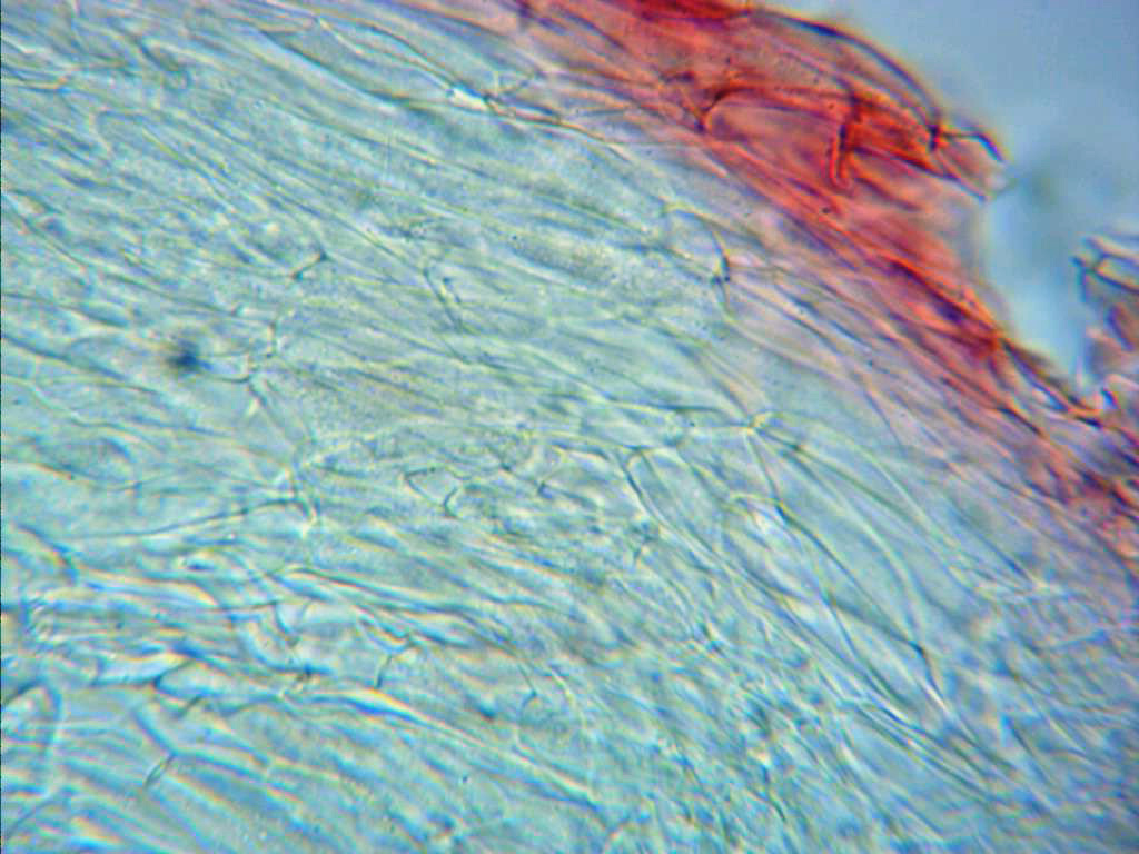 Pileipellis de Mycena con subpellis propia de la especie por sus hifas largas.