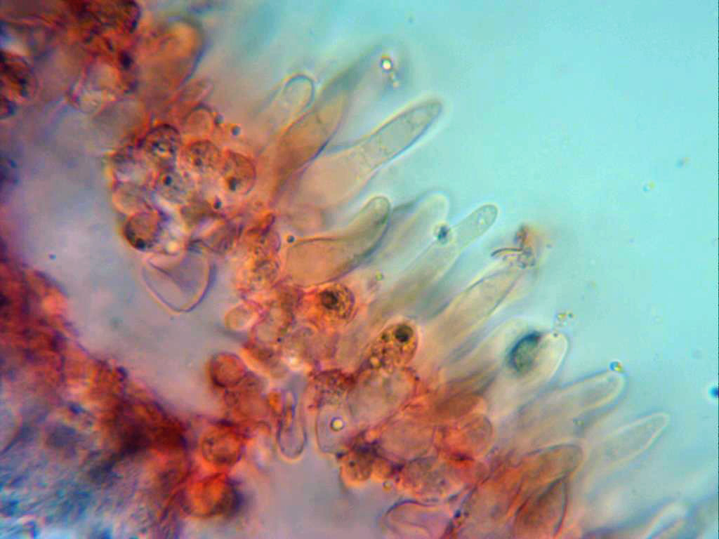 Caulocistidios abundantes, mayoritariamente en forma de ramilletes, alargados, ventrudos, algunos de sinuosos y terminados en formas redondeadas, las medidas de estos de 13 a 33,3 µm de largo por 3,9 a 5,8 µm de ancho.