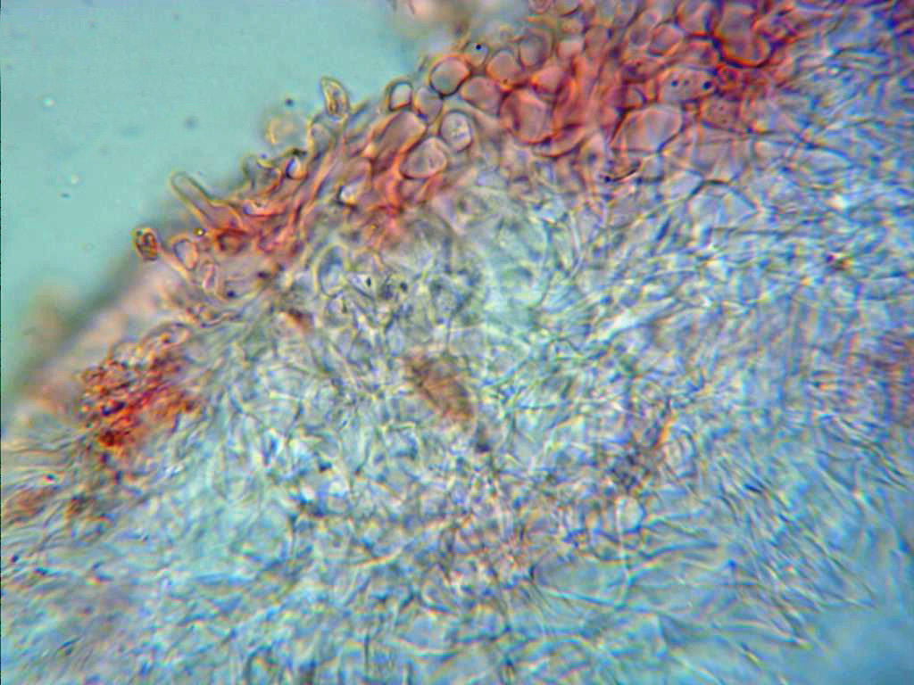 Hifas de la pileipellis irregulares, anchas y con un ligero pigmento, debido a su complejidad no pude observar fíbulas en ellas.