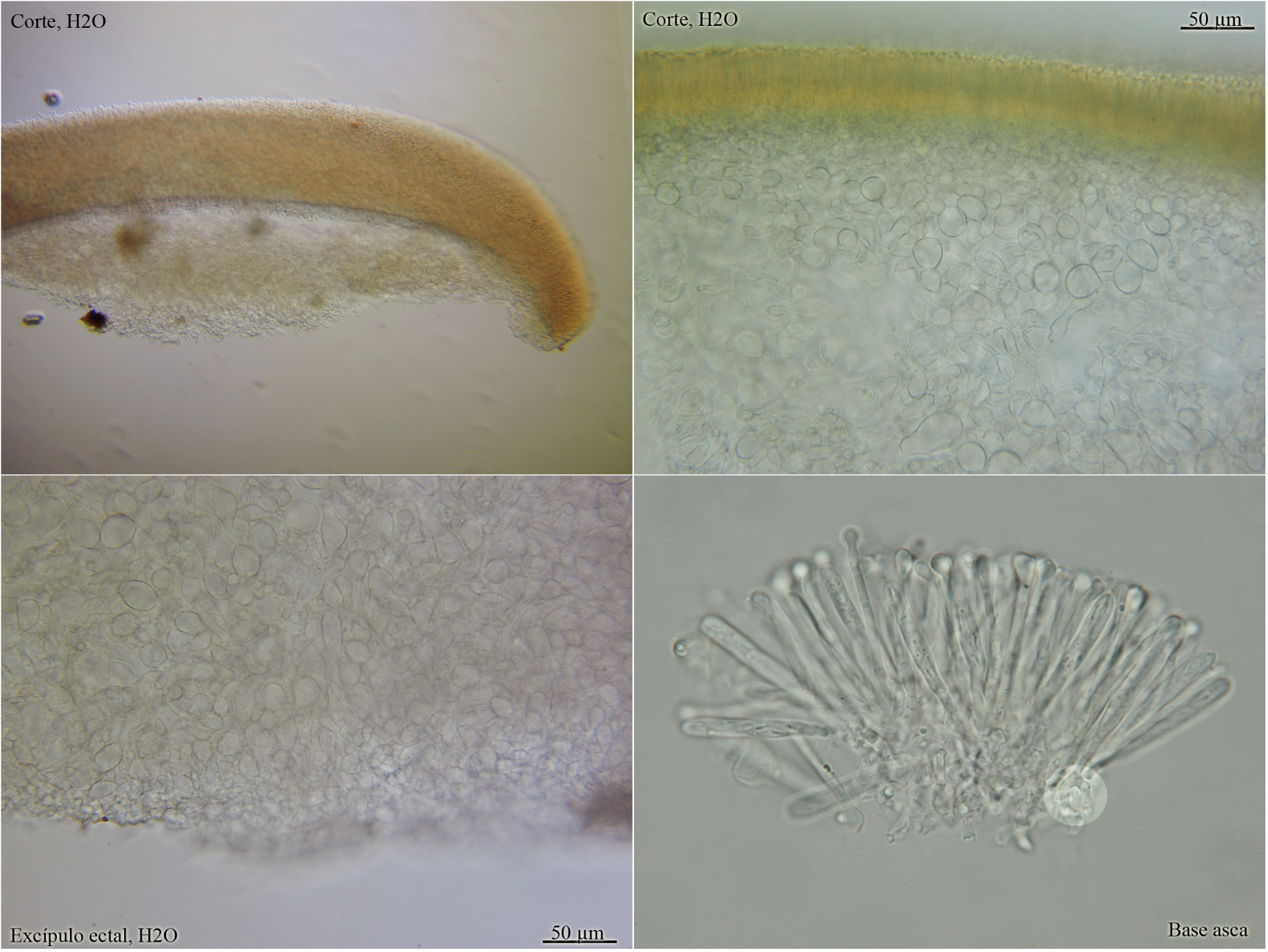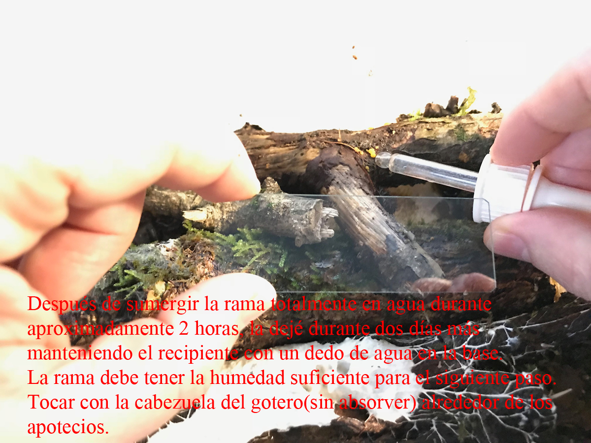 Para observar la forma conidial, mantuve la rama durante dos días en cámara húmeda y con la cabezuela de un gotero, toqué repetidamente la madera (sin succión) en las proximidades del apotecio para transferir el contenido a un porta. Si deseáis ver este proceso me lo comentáis y subo un par de fotos explicándolo.