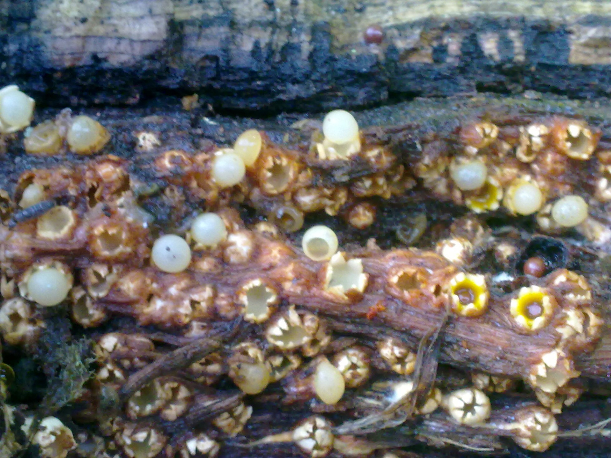 Gracias Javier, eso de que muchas veces estas especies diminutas se nos pasan desapercibidas es ya algo habitual en mi caso, te dejo una imágen mía del 30 de Noviembre de 2016 de una Exidia nucleata = Myxarum nucleatum, que al llegar a casa y ampliar la imágen pude observar unos pequeños apotecios de color amarillo que en el momento de la foto no advertí su presencia.