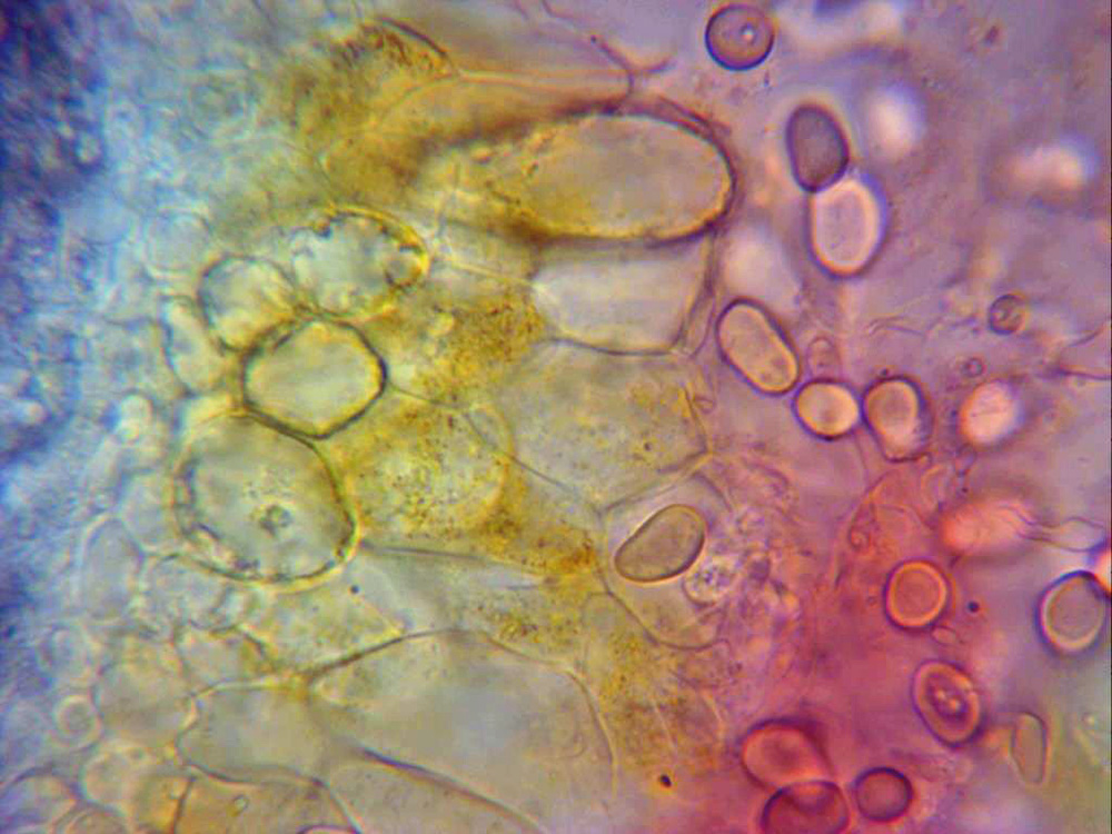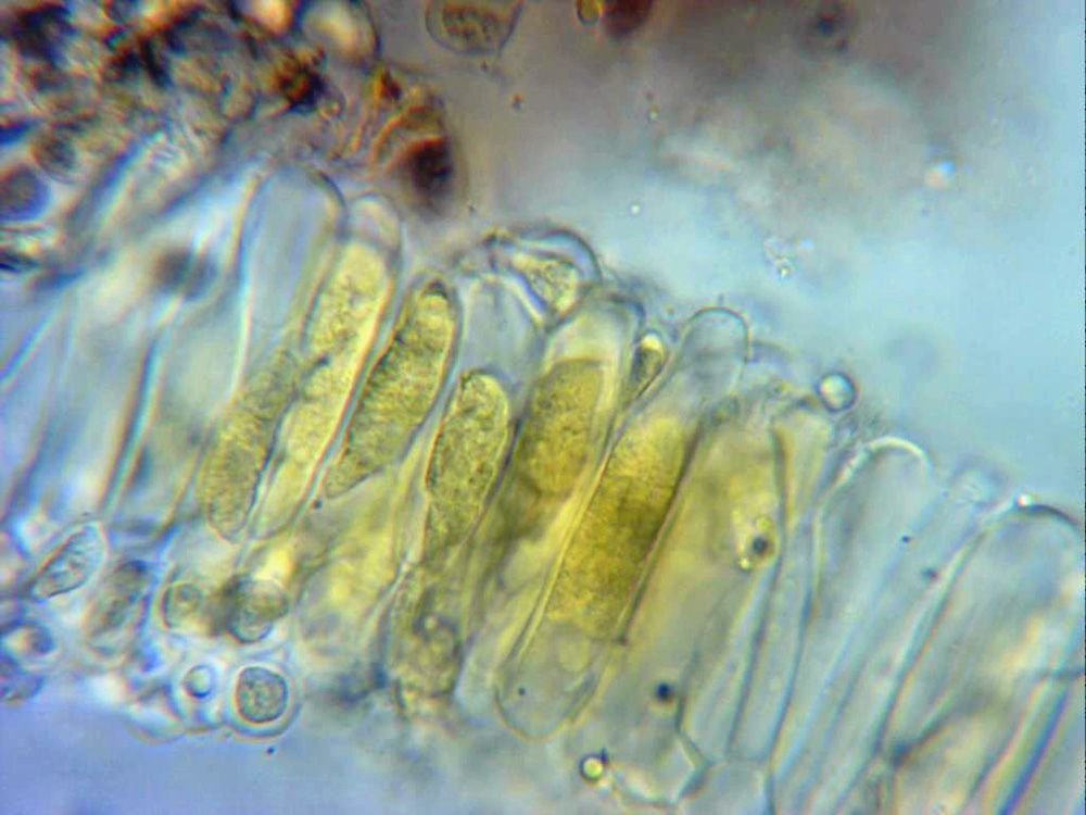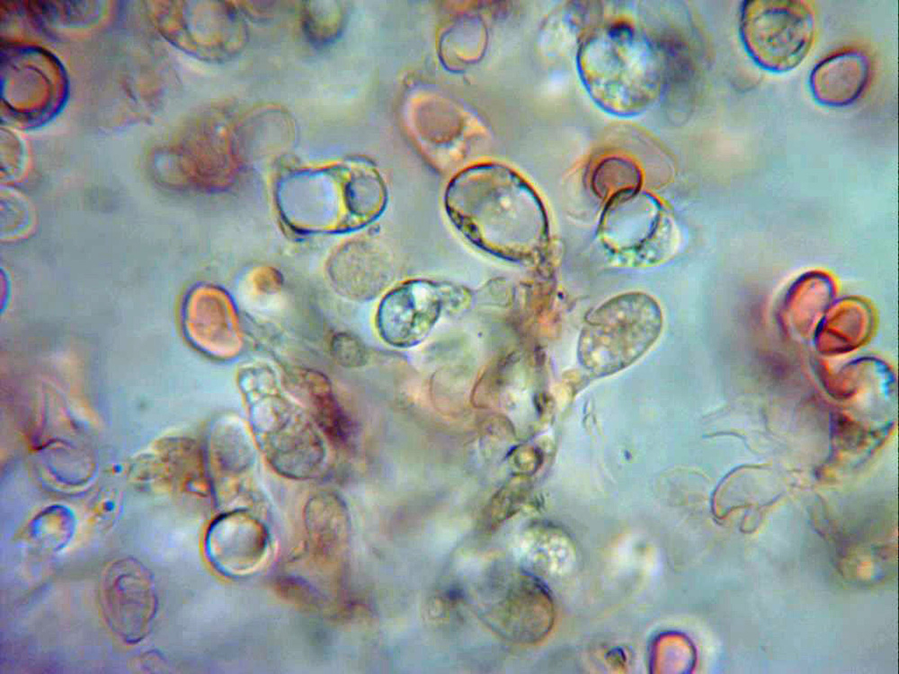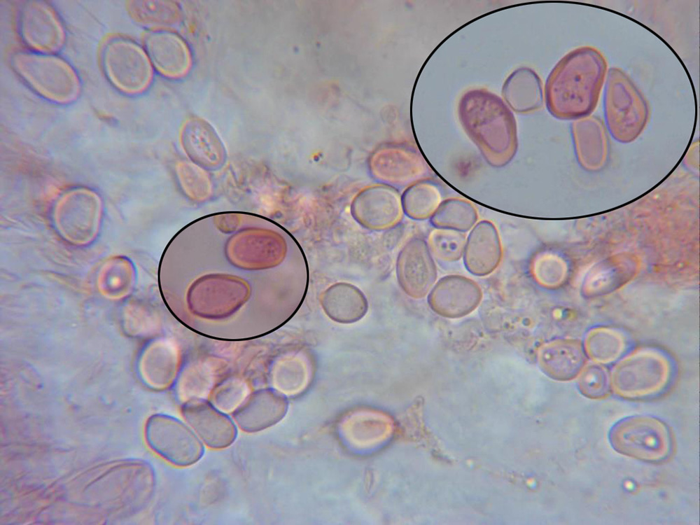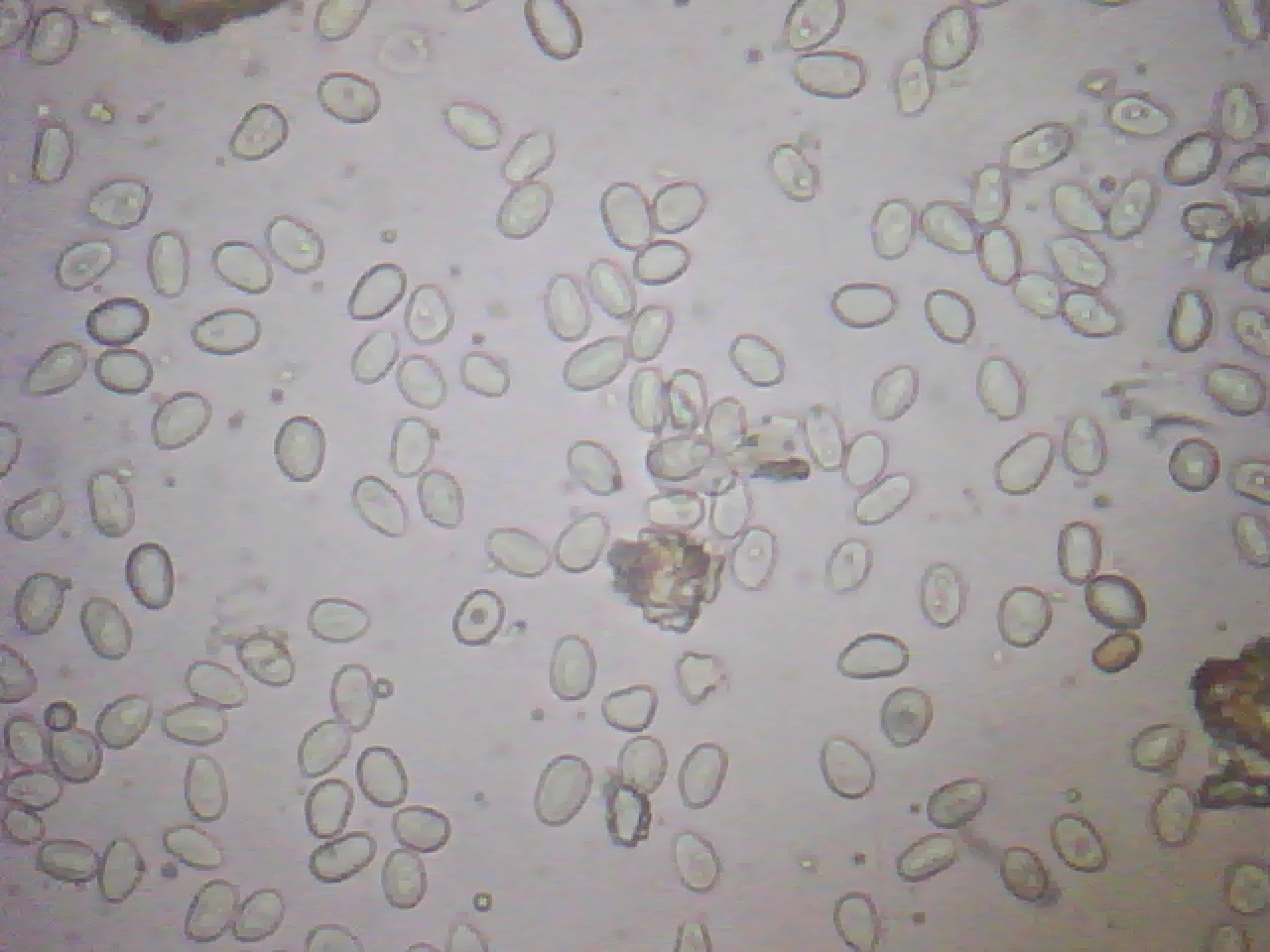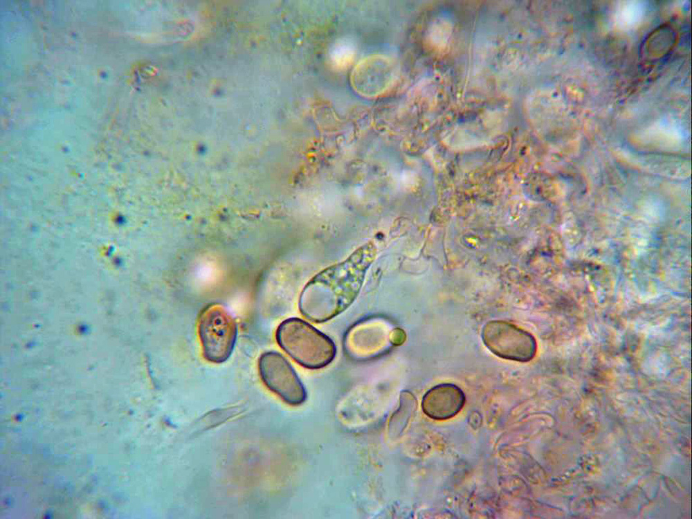 Esporas hialinas, de pared gruesa, entre elípticas y ovoides, algunas con formas mas irregulares, en mis mediciones de 8,3;11,8 X 4,8;6,8 micras.