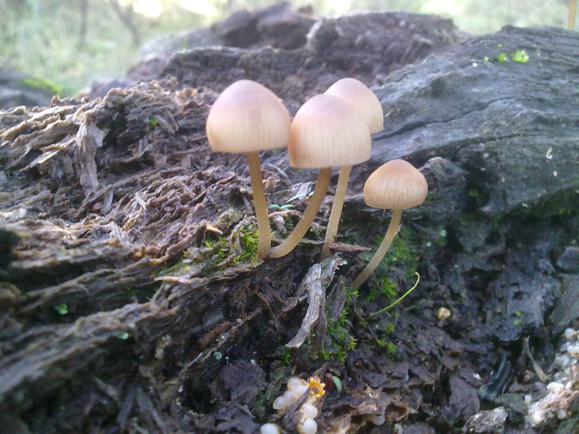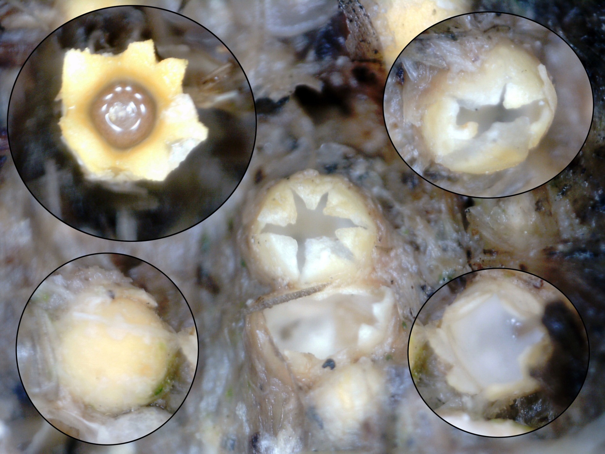 Ya de paso os pongo otra imagen curiosa, y es que estos carpóforos son tan peques y pasan tanto desapercibidos que tratando de fotografiar un pequeño grupo de Mycenas aparecieron algunos de estos Sphaerobolus stellatus como podéis ver en la parte inferior de esta foto.