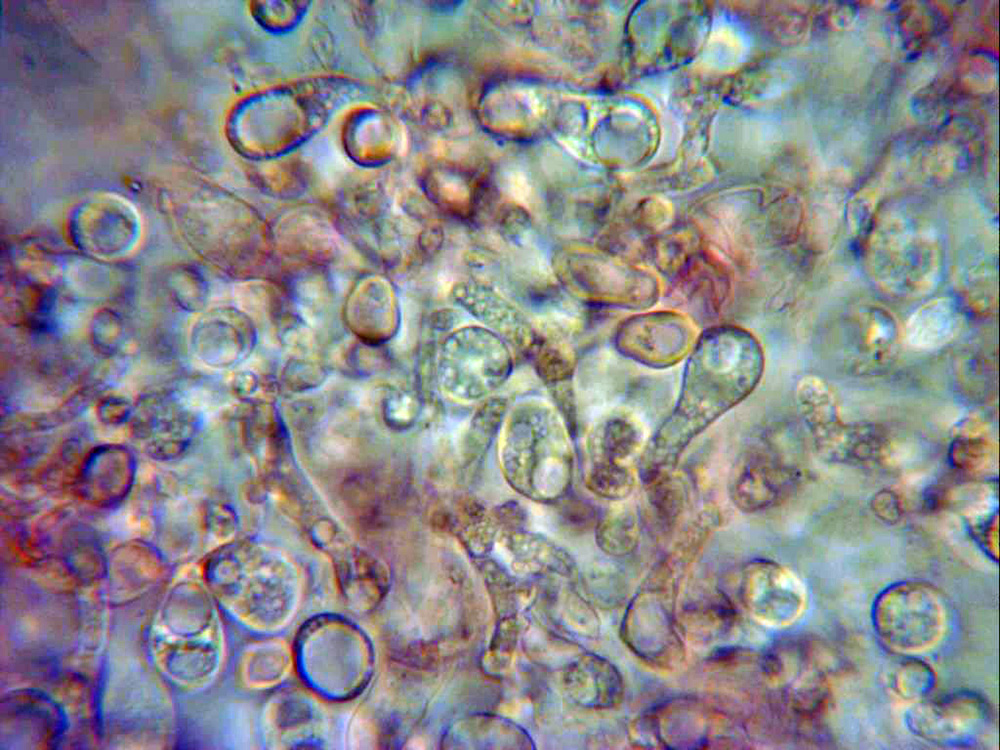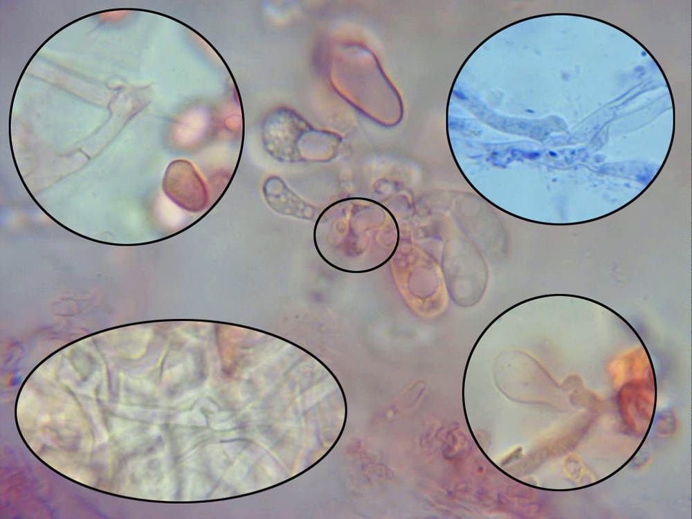 En las muestras pude observar una gran cantidad de células terminales de forma redondeada a piriforme, con fíbulas en su base, quizás pueda tratarse de conidióforos, aunque este punto no lo tengo nada claro.