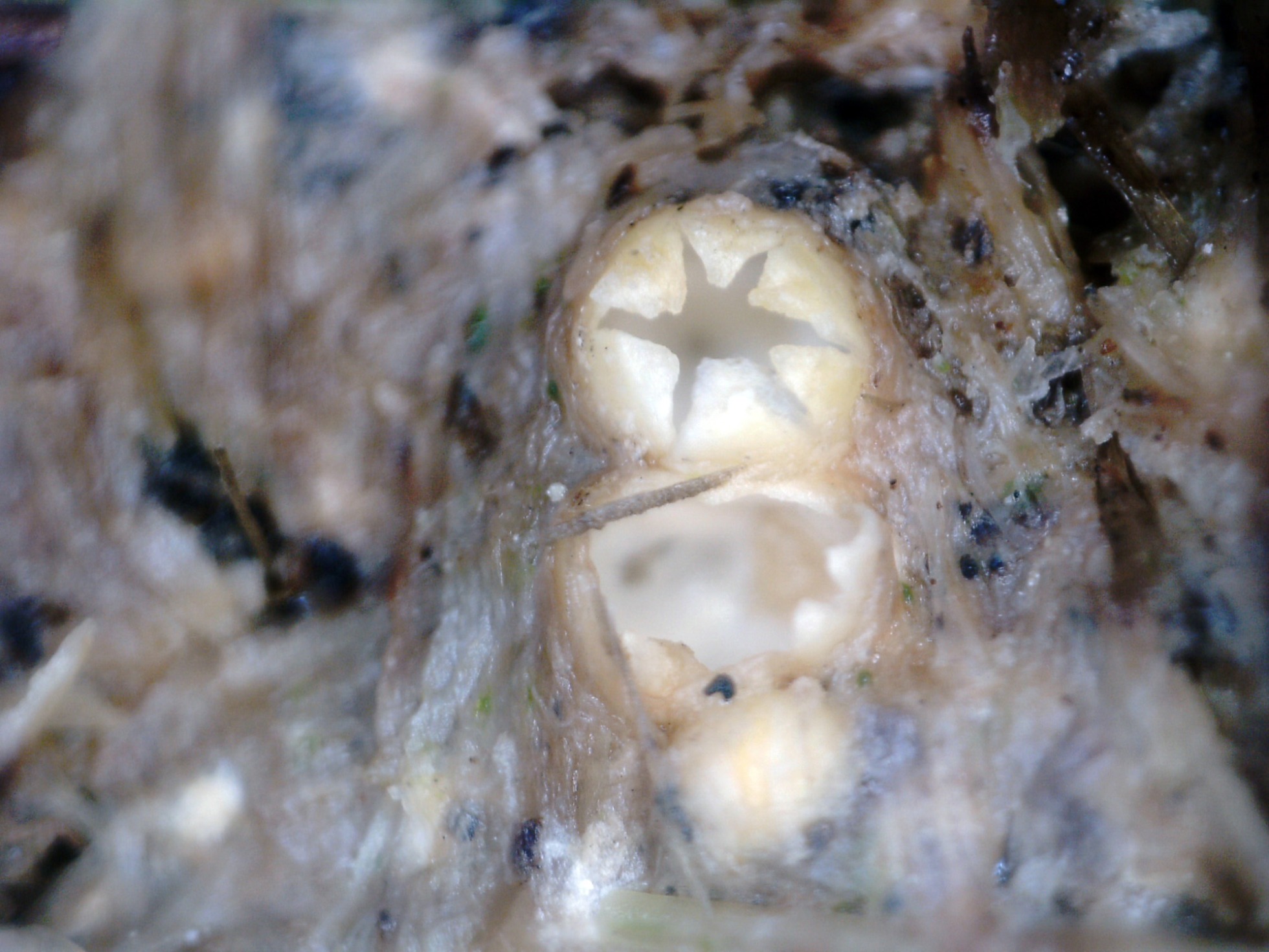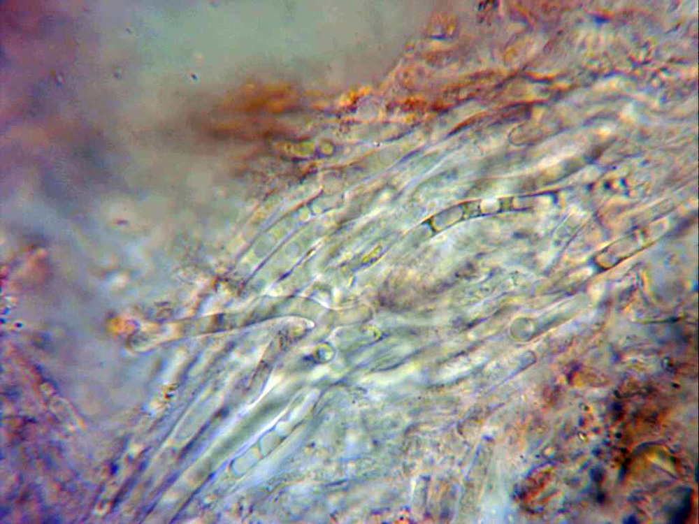 Hifas de la cubierta exterior, alargadas, dispuestas paralelamente, algunas hasta ramificadas y con contenido oleoso en su interior.