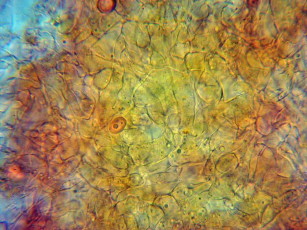 Hifas del contexto, con formas variadas, dispuestas irregularmente formando un amasijo, con pigmentación ocrácea.