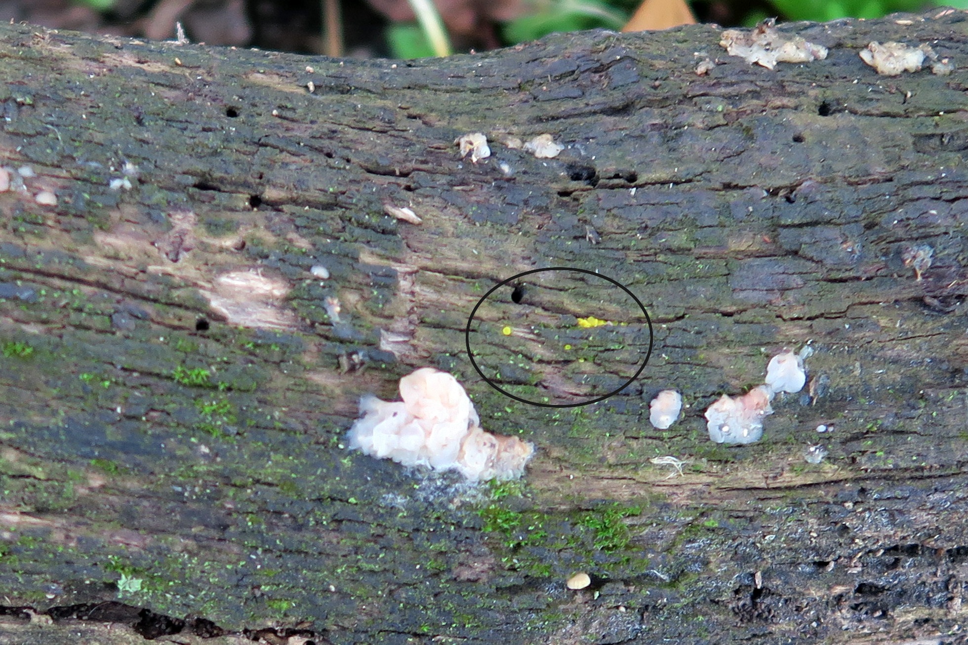 En el círculo se pueden apreciar los apotecios, en aquel entonces supuse que podría tratarse de Bisporella citrina, un cromo que me faltaba, al regresar al lugar ya no había ni rastro de ellos. Ahora y después de más de un año y en el mismo tronco han vuelto a brotar, los encontré el pasado viernes y los voy a presentar en breve, ya adelanto que no se trata de Bisporella citrina.
