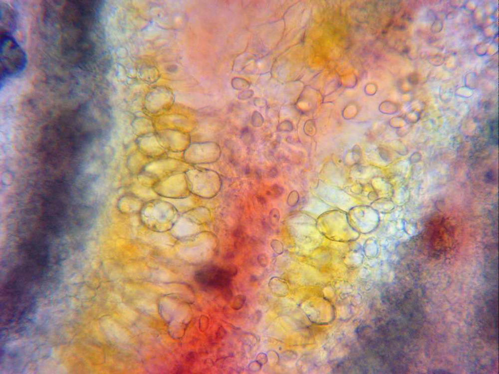La misma sección a 1000 aumentos, en la parte derecha de la imágen, que se corresponde con el interior, se pueden apreciar algunas esporas.