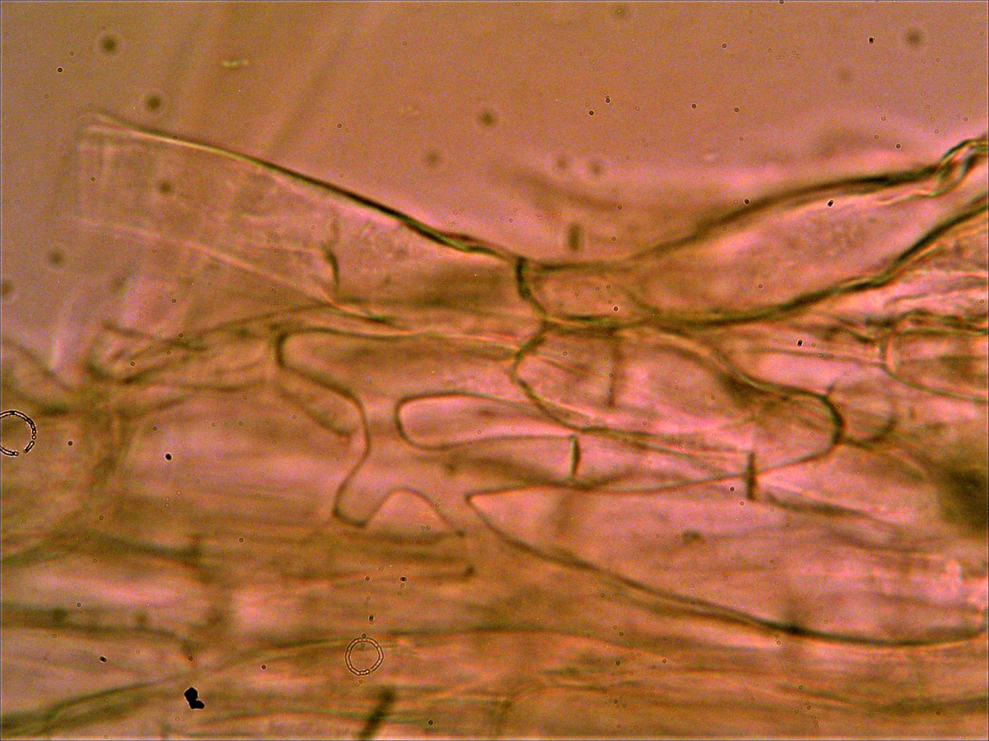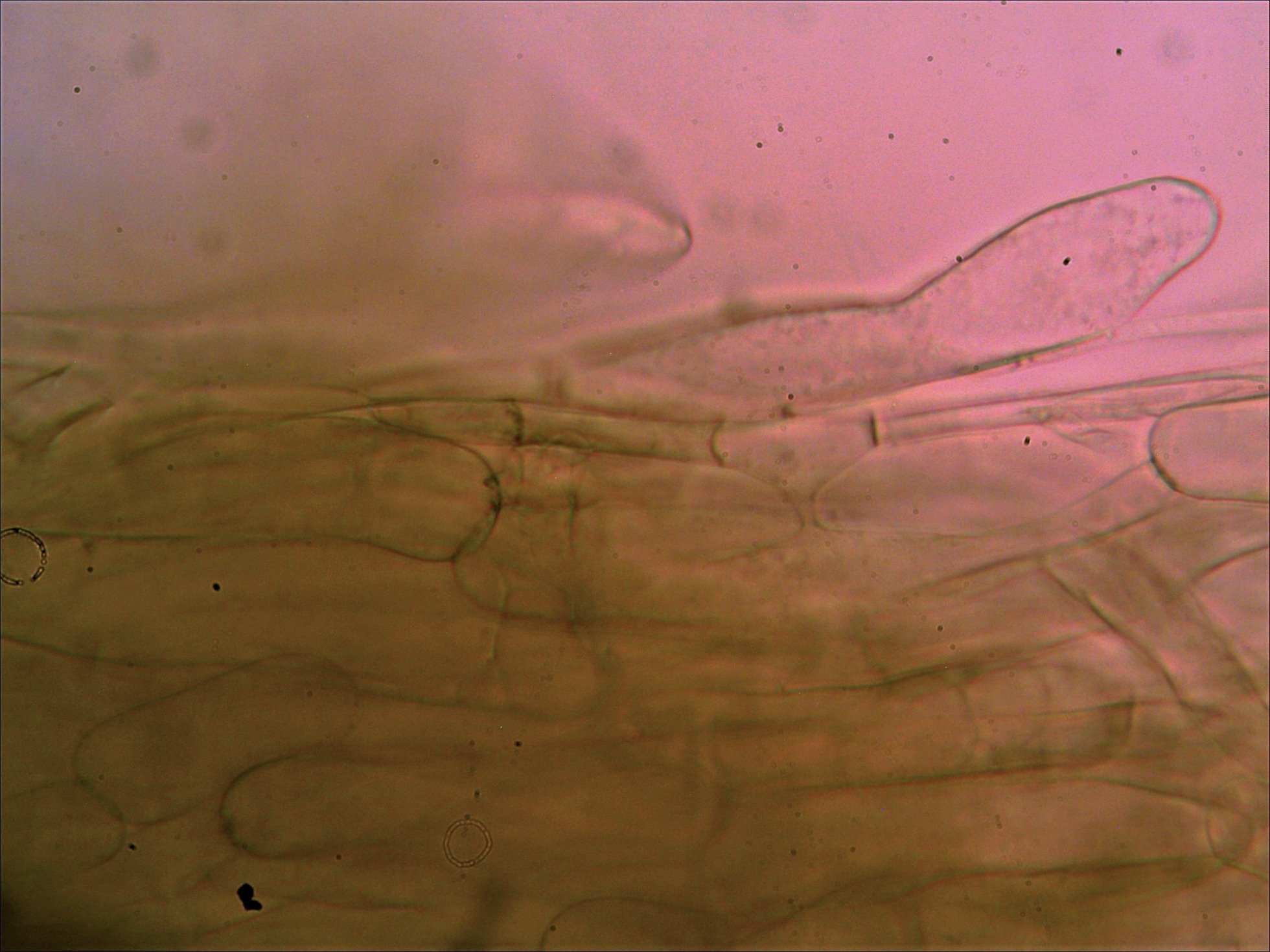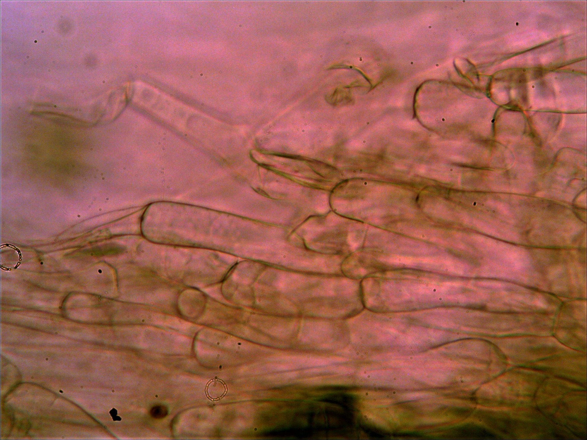 Imágenes de la pileipellis, en esta caso, suprapellis, compuesta por hifas cilíndricas y septadas.