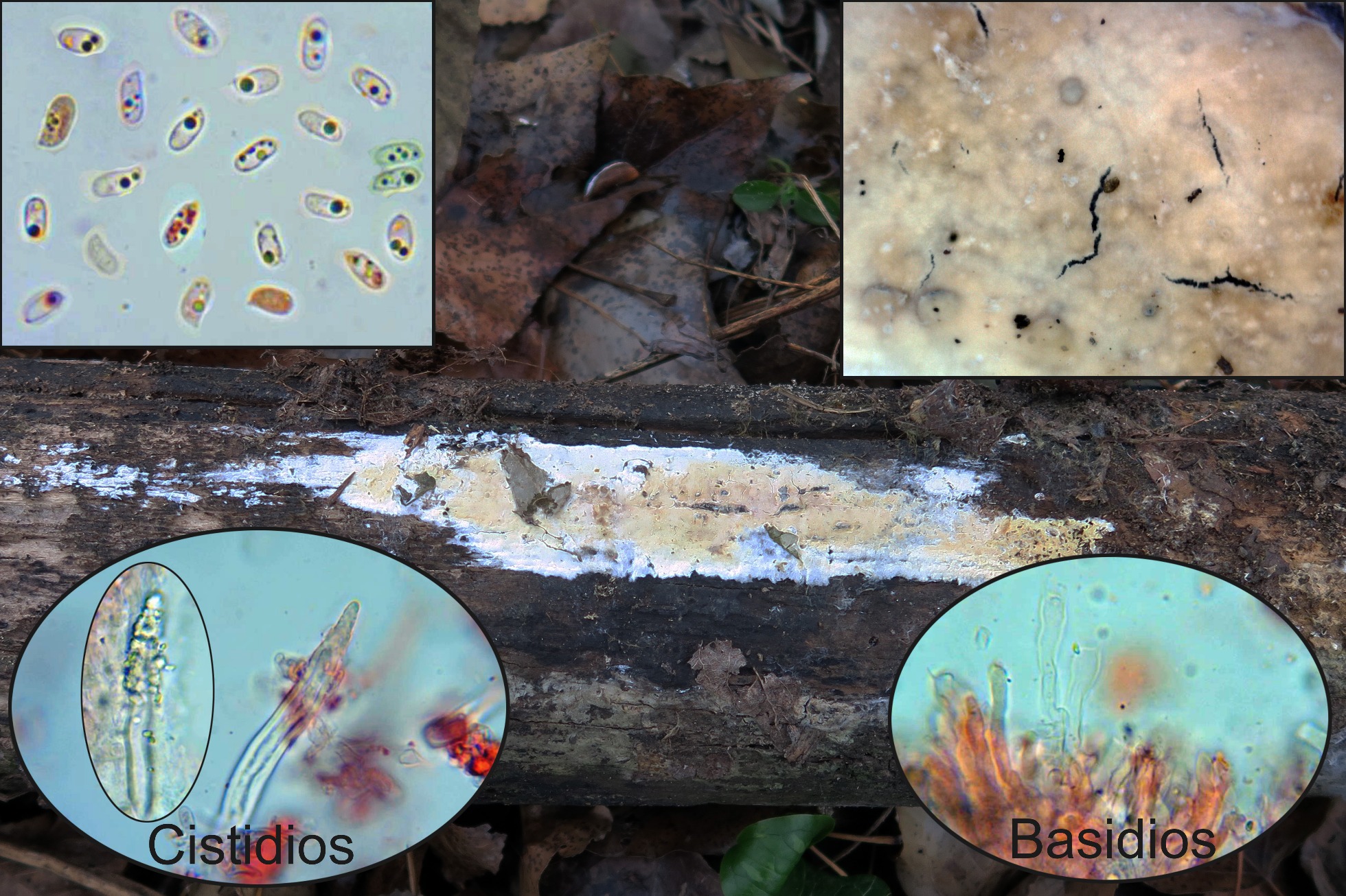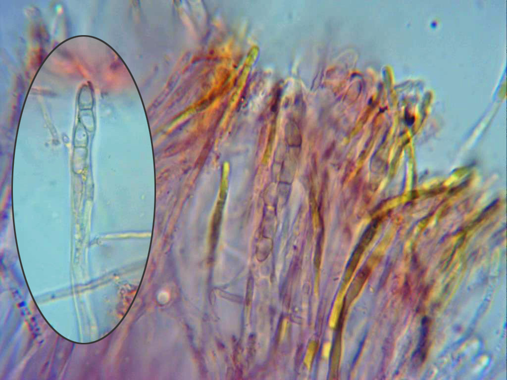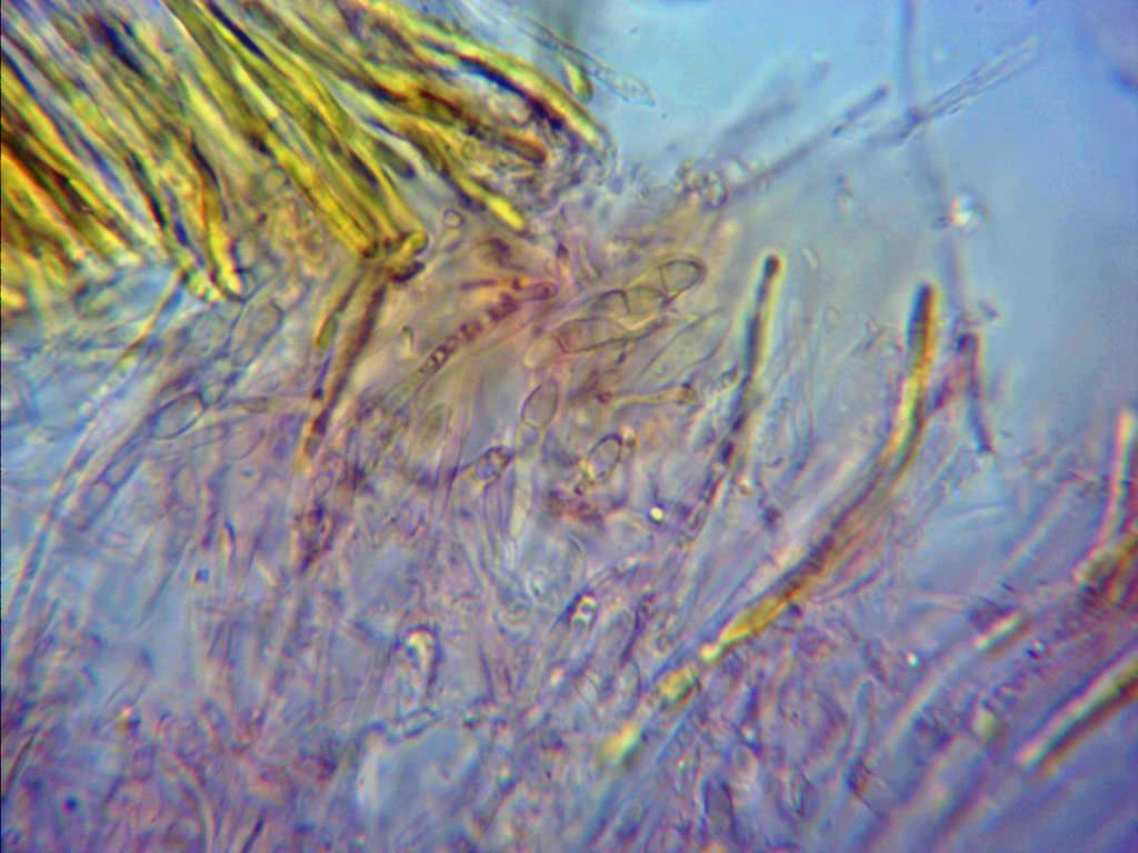 Esta es una de las que creía tener, pero que hasta ahora no he podido confirmar con el micro. Con cistidios en forma de seta, con cristalizaciones en su superficie y de considerable tamaño, basidios cilíndricos, hialinos muy alargados y tetraspóricos.